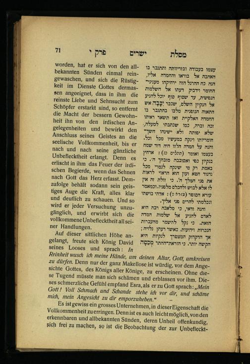Lebensführung der Redlichen / von Mosche Chaim Luzzatto. Mit einer neben dem Text befindlichen dt. Übers. von Oskar Sachariasohn
