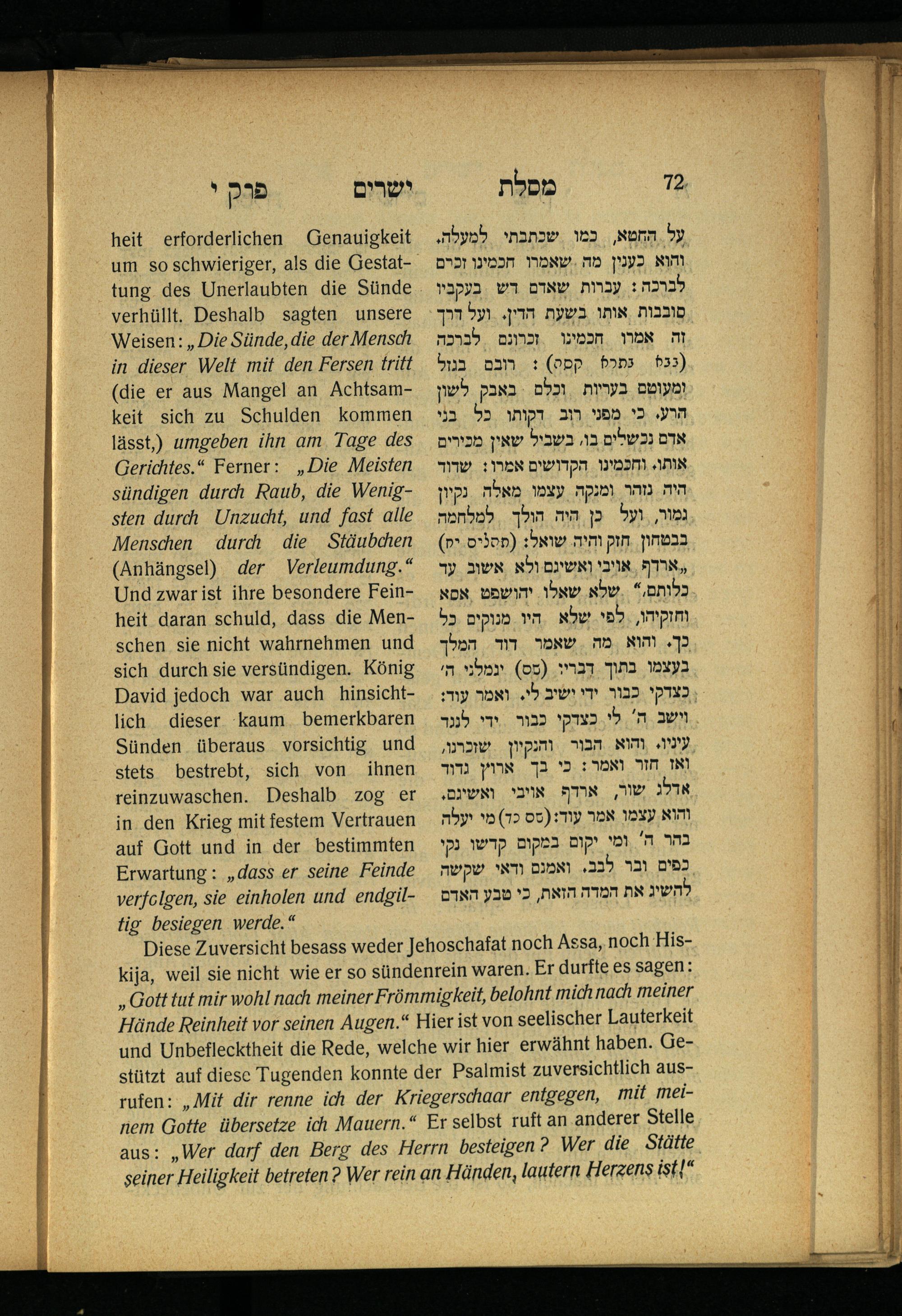 Lebensführung der Redlichen / von Mosche Chaim Luzzatto. Mit einer neben dem Text befindlichen dt. Übers. von Oskar Sachariasohn