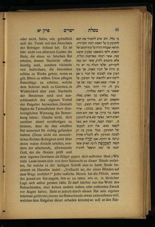 Lebensführung der Redlichen / von Mosche Chaim Luzzatto. Mit einer neben dem Text befindlichen dt. Übers. von Oskar Sachariasohn