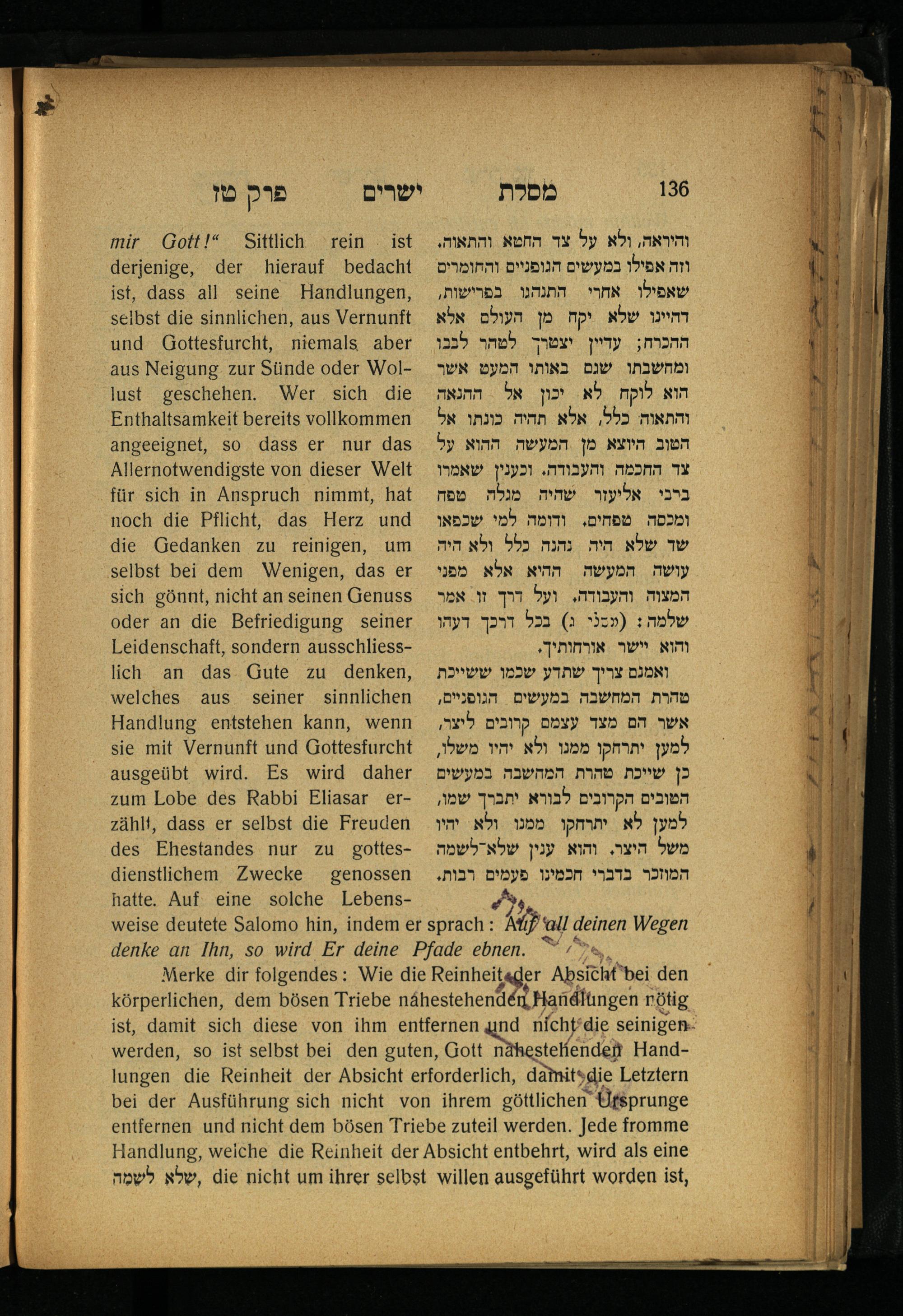 Lebensführung der Redlichen / von Mosche Chaim Luzzatto. Mit einer neben dem Text befindlichen dt. Übers. von Oskar Sachariasohn