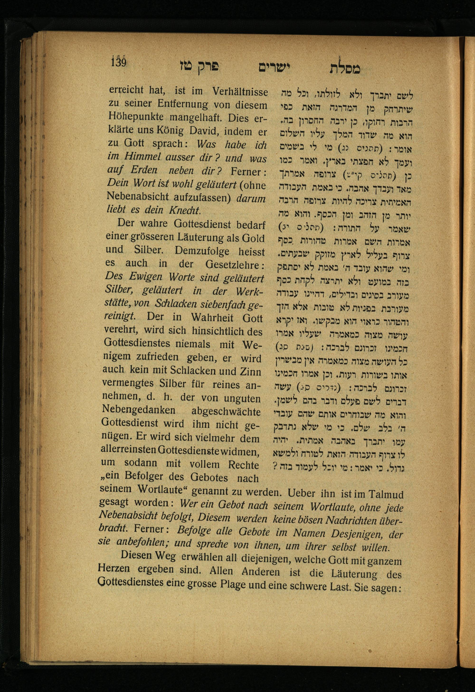Lebensführung der Redlichen / von Mosche Chaim Luzzatto. Mit einer neben dem Text befindlichen dt. Übers. von Oskar Sachariasohn