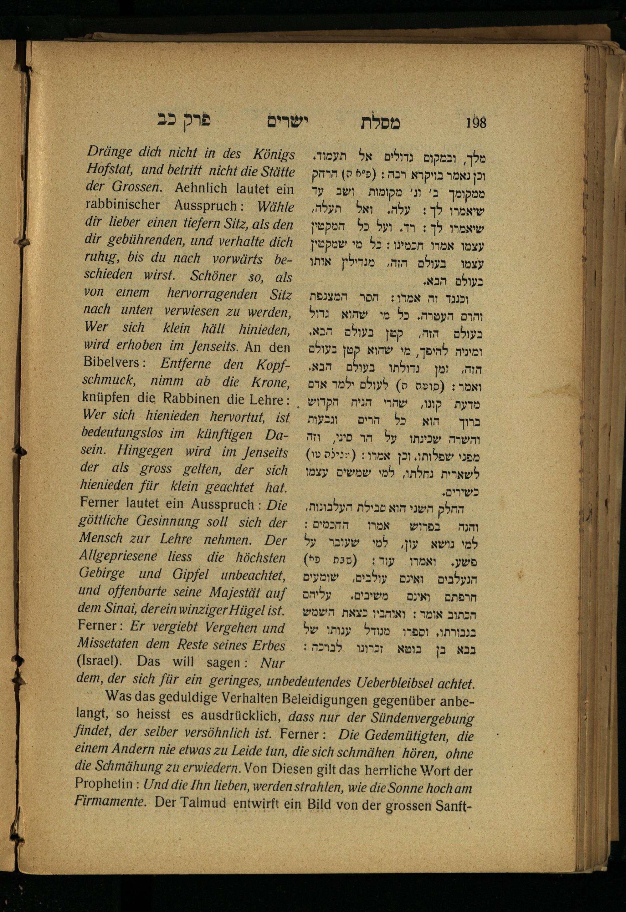 Lebensführung der Redlichen / von Mosche Chaim Luzzatto. Mit einer neben dem Text befindlichen dt. Übers. von Oskar Sachariasohn