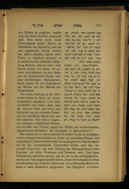 Lebensführung der Redlichen / von Mosche Chaim Luzzatto. Mit einer neben dem Text befindlichen dt. Übers. von Oskar Sachariasohn