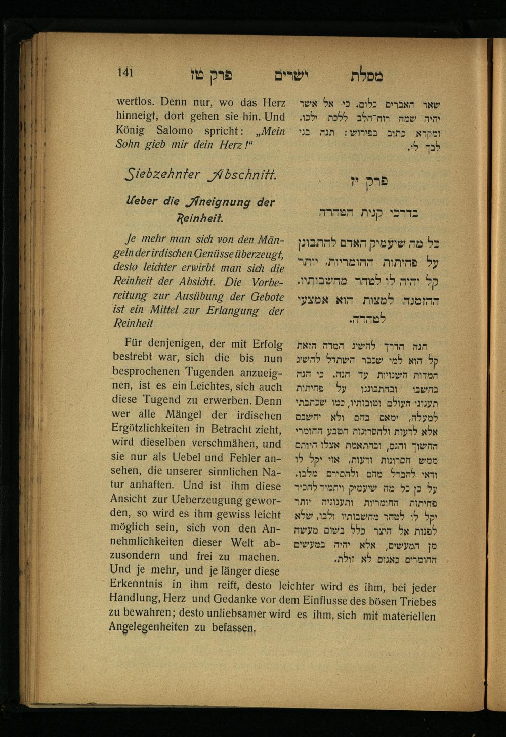 Lebensführung der Redlichen / von Mosche Chaim Luzzatto. Mit einer neben dem Text befindlichen dt. Übers. von Oskar Sachariasohn