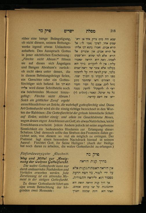 Lebensführung der Redlichen / von Mosche Chaim Luzzatto. Mit einer neben dem Text befindlichen dt. Übers. von Oskar Sachariasohn