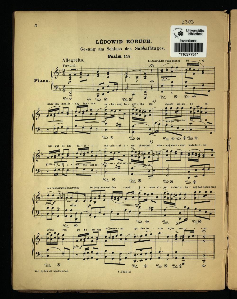 Ledowid Boruch. Gesang am Schluss des Sabbathtages. Pslam 144.