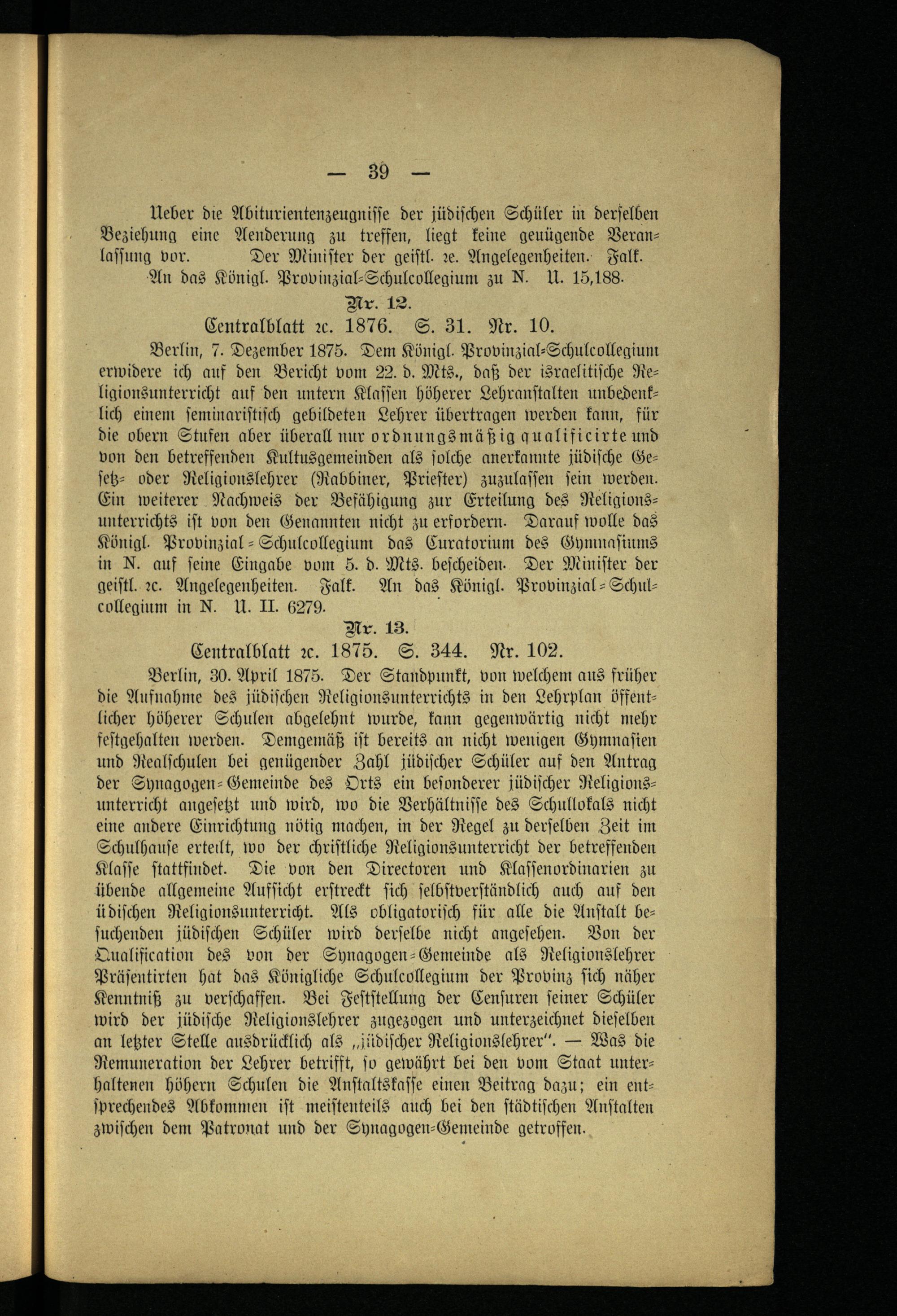 Anlage III. Gesetze, Reskripte, Verordnungen u.s.w. über den jüdischen Religions-Unterricht.