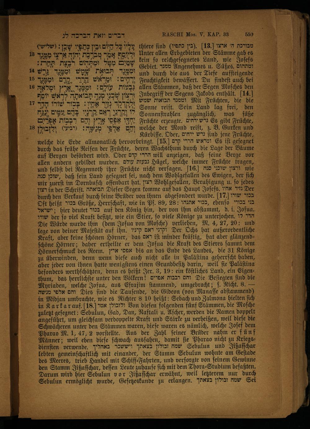 Der Raschi-Kommentar zu den fünf Büchern Moses / vollständig ins Deutsche übersetzt mit beigedrucktem Bibel-Texte in einem Bande von Julius Dessauer, emerit. Rabb., Herausgeber des: "Lexikon der Kernsprüche für Talmud und Midrasch", des "Schlüssel zum Gebetbuch sammt Ritualgesetze der Israeliten ... u.a.m.