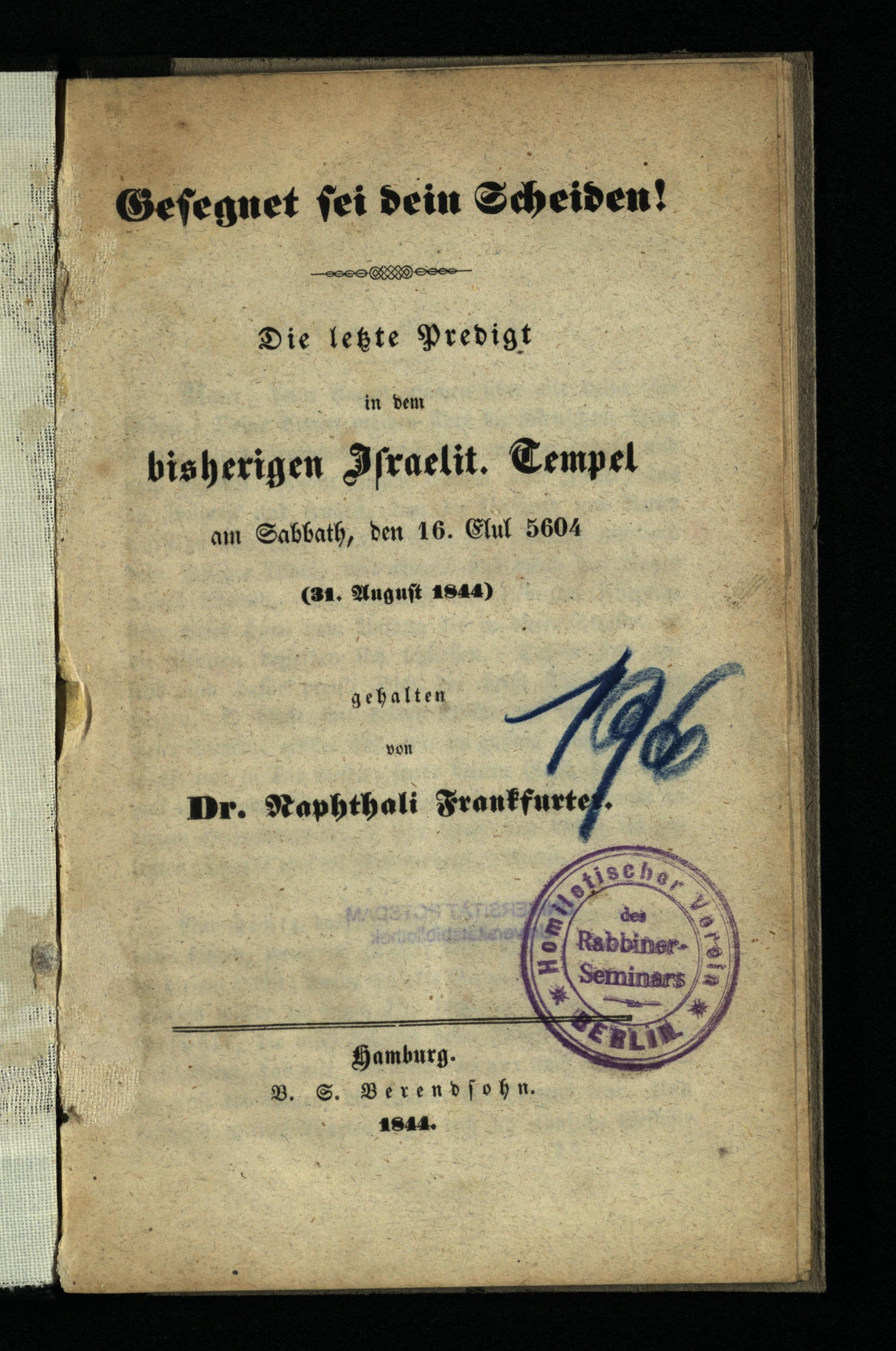 Gesegnet sei dein Scheiden!· : die letzte Predigt in dem bisherigen Israelit. Tempel am Sabbath, den 16. Elul 5604 (31. August 1844) / gehalten von Naphthali Frankfurter