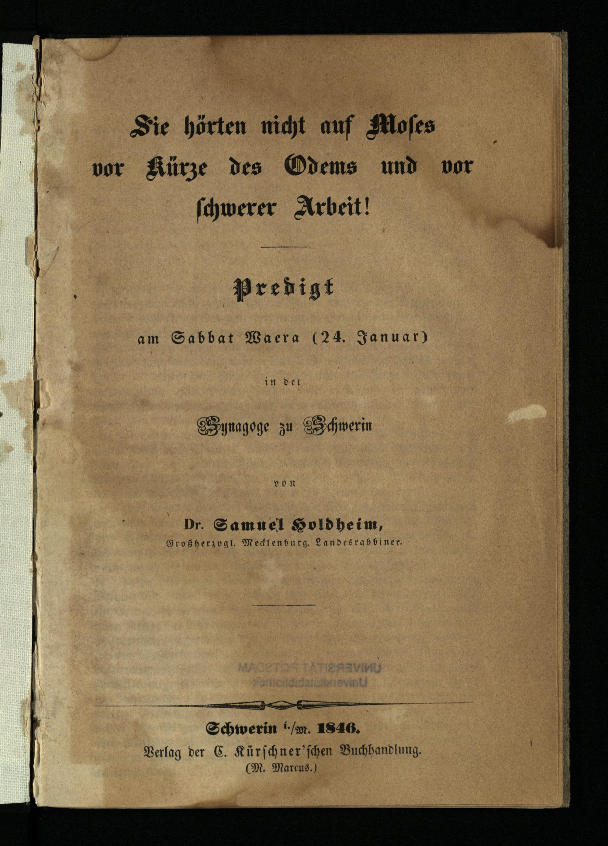 Sie hörten nicht auf Moses vor Kürze des Odems und vor schwerer Arbeit! : Predigt am Sabbat Waera (24. Januar) in der Synagoge zu Schwerin / von Dr. Samuel Holdheim, Großherzogl. Mecklenburg. Landesrabbiner
