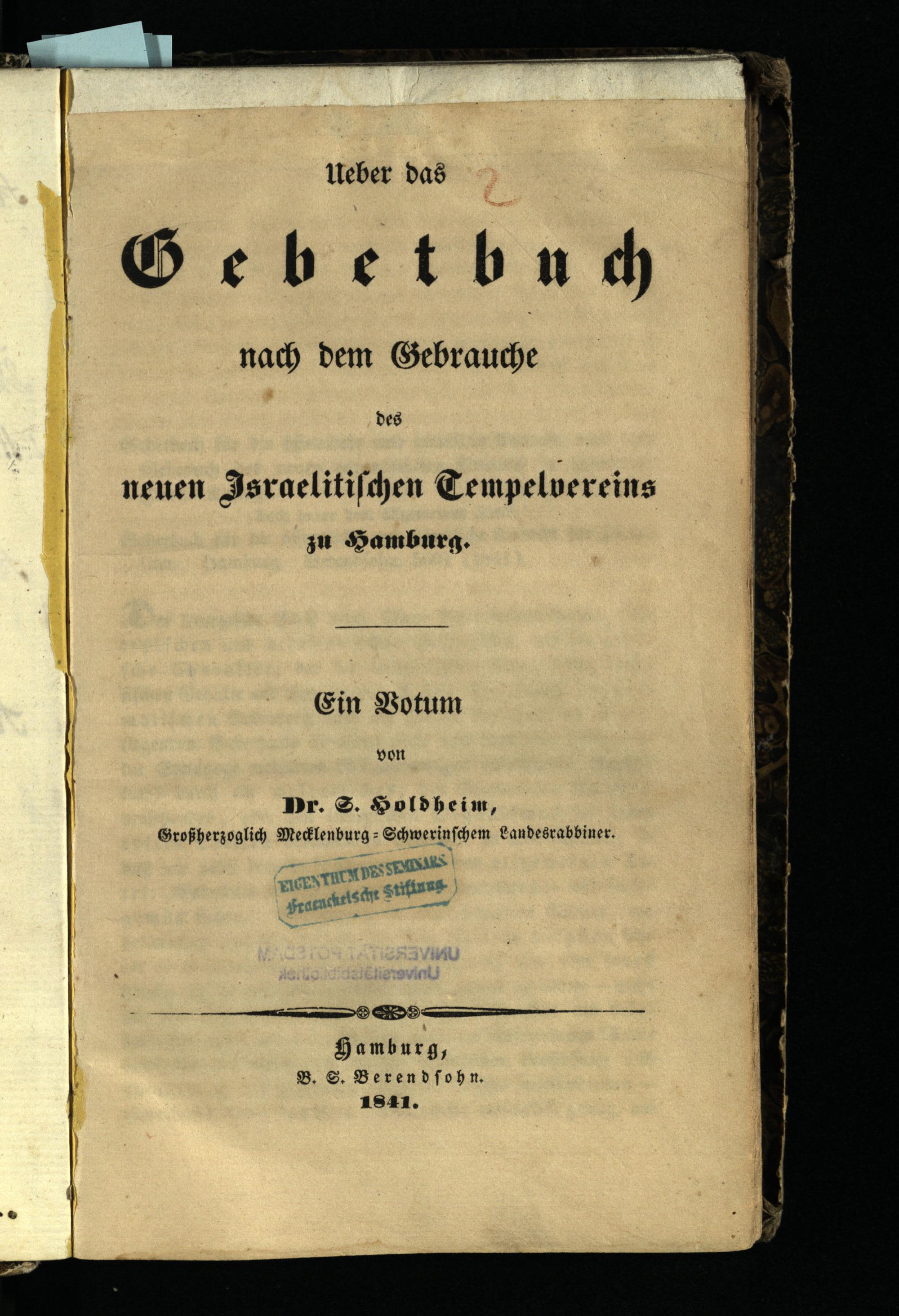 Ueber das Gebetbuch nach dem Gebrauche des neuen Israelitischen Tempelvereins zu Hamburg : ein Votum / von Dr. S. Holdheim, Großherzoglich Mecklenburg-Schwerinschem Landesrabbiner
