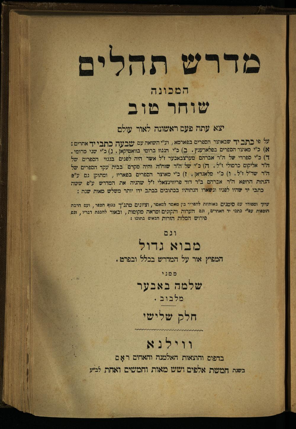 midraš tehilim : Sammlung agadischer Abhandlungen über die 150 Psalmen / mi-meni Šelomoh Buber