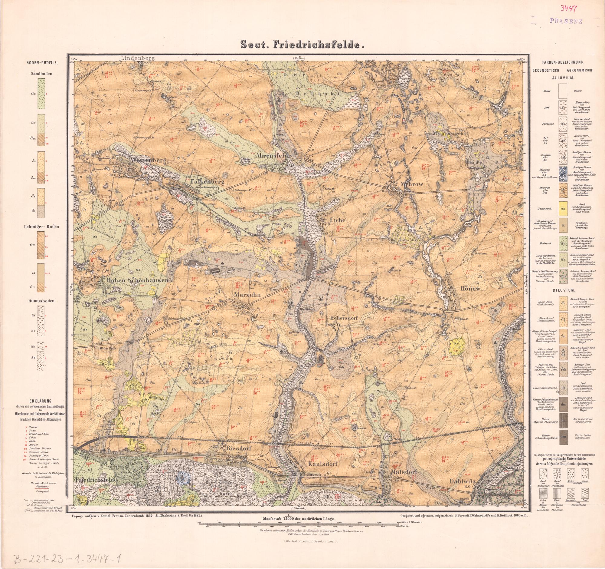 [Neue Nr. 3447] (1882) Sect. Friedrichsfelde : [geologische Karte] / geognostisch und agronomisch aufgenommen durch G. Berendt, F. Wahnschaffe und K. Keilhack