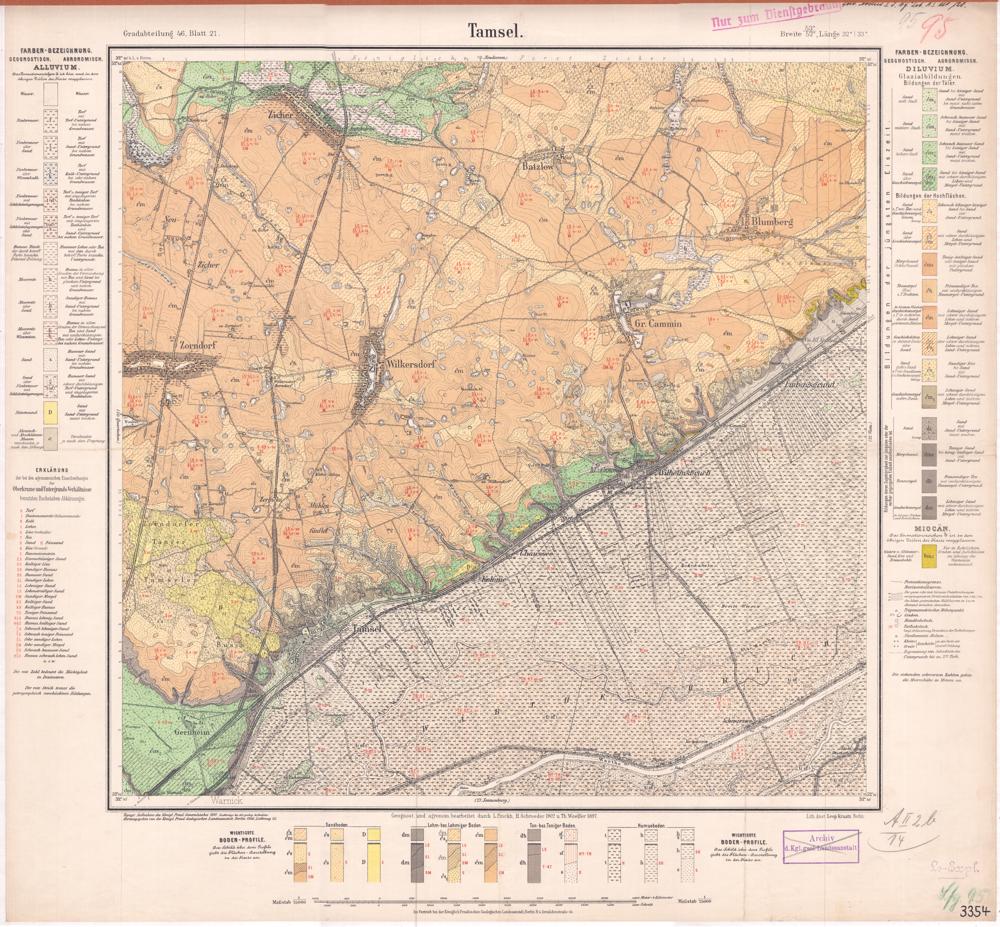 Grad-Abtheilung 46, Blatt 21 [Neue Nr. 3354] (1908) Tamsel : [geologische Karte] / geognostisch und agronomisch bearb. durch L. Finckh, H. Schroeder und Th. Woelfer