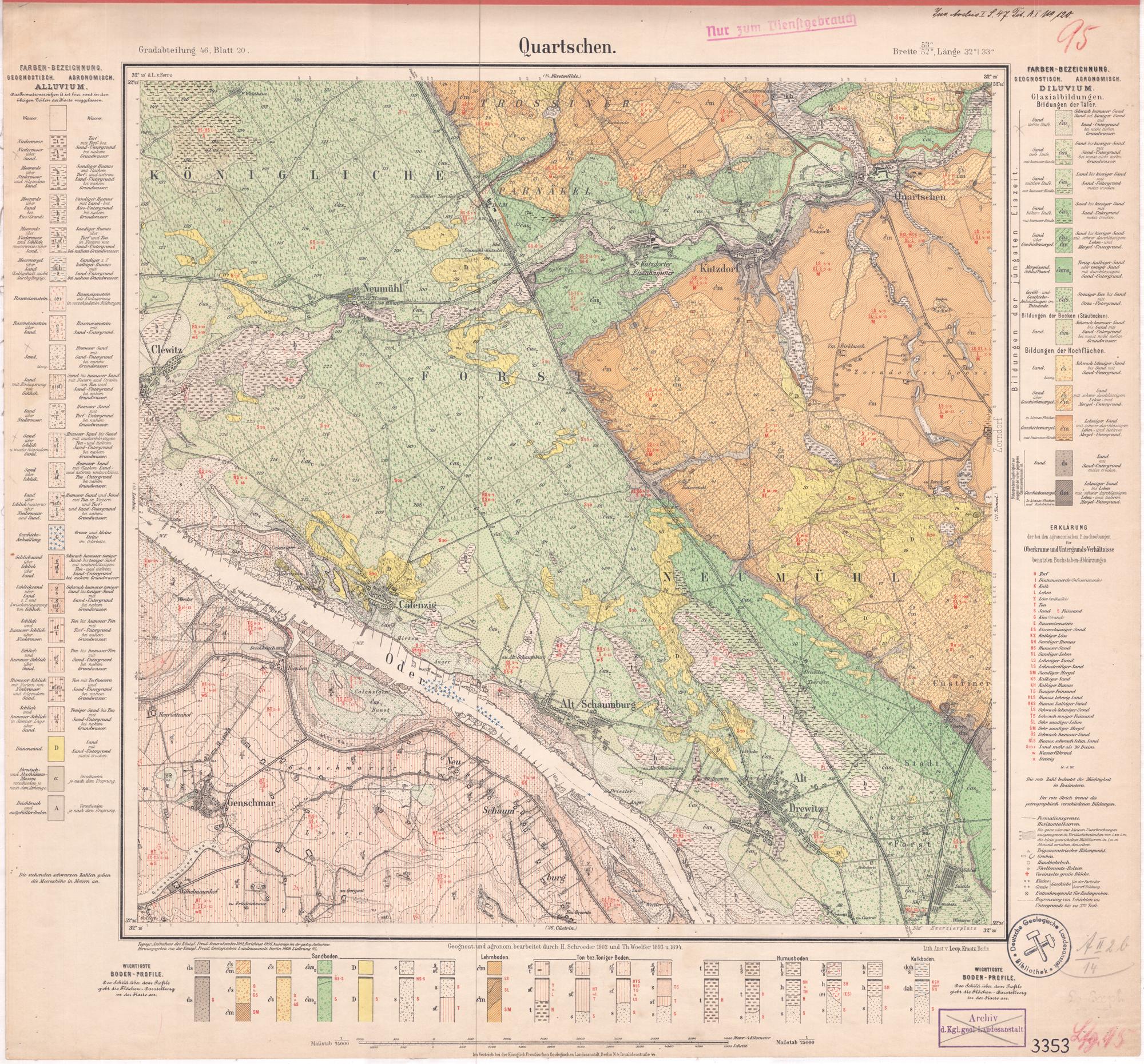 Grad-Abtheilung 46, Blatt 20 [Neue Nr. 3353] (1908) Quartschen : [geologische Karte] / geognostisch und agronomisch bearb. durch H. Schroeder und Th. Woelfer
