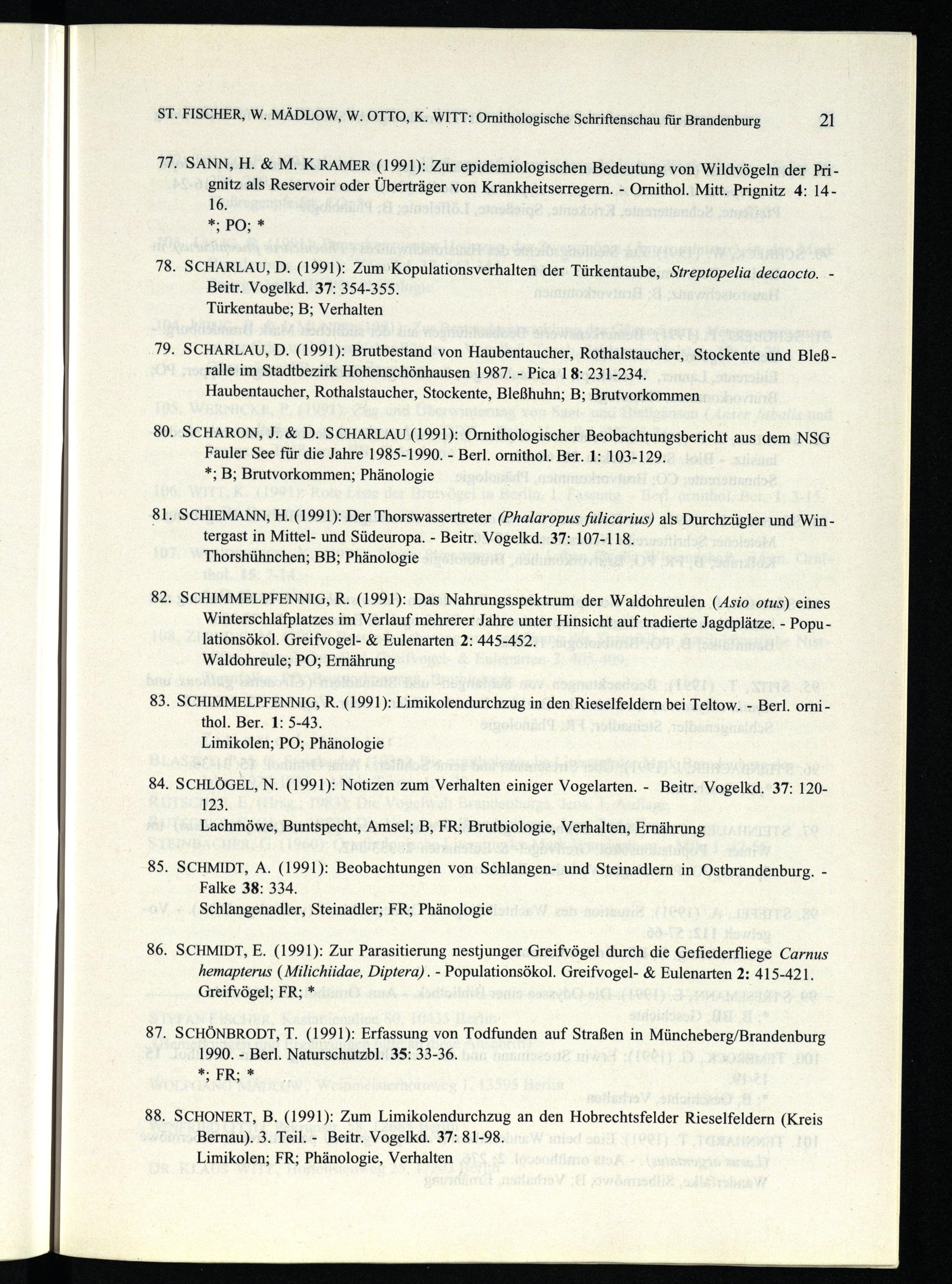 . SCHARON, J.& D. SCHARLAU(1991): Ornithologischer Beobachtungsbericht aus dem NSG Fauler See für die Jahre 1985-1990.- Berl. ornithol. Ber. 1: 103-129. *; B; Brutvorkommen; Phänologie