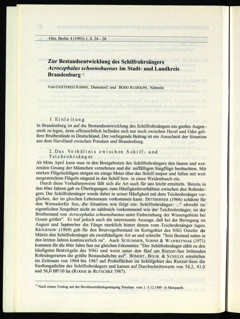 1.Einleitung In Brandenburg ist auf die Bestandsentwicklung des Schilfrohrsängers ein großes Augen merk zu legen, denn offensichtlich befinden sich nur noch zwischen Havel und Oder größere Brutbestände in Deutschland . Der vorliegende Beitrag ist ein Ausschnitt der Situation aus dem Havelland zwischen Potsdam und Brandenburg .