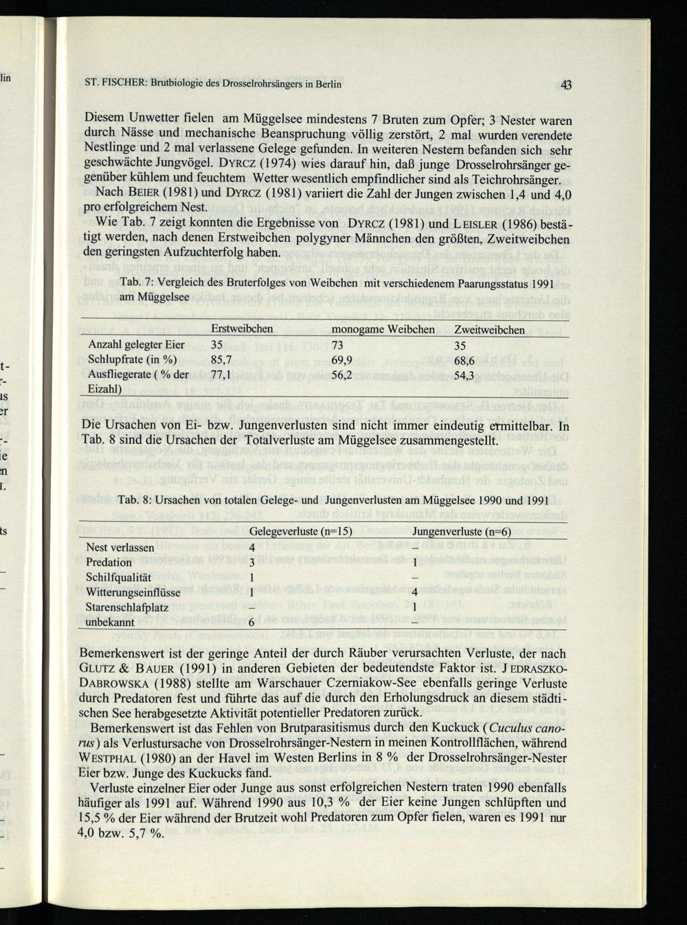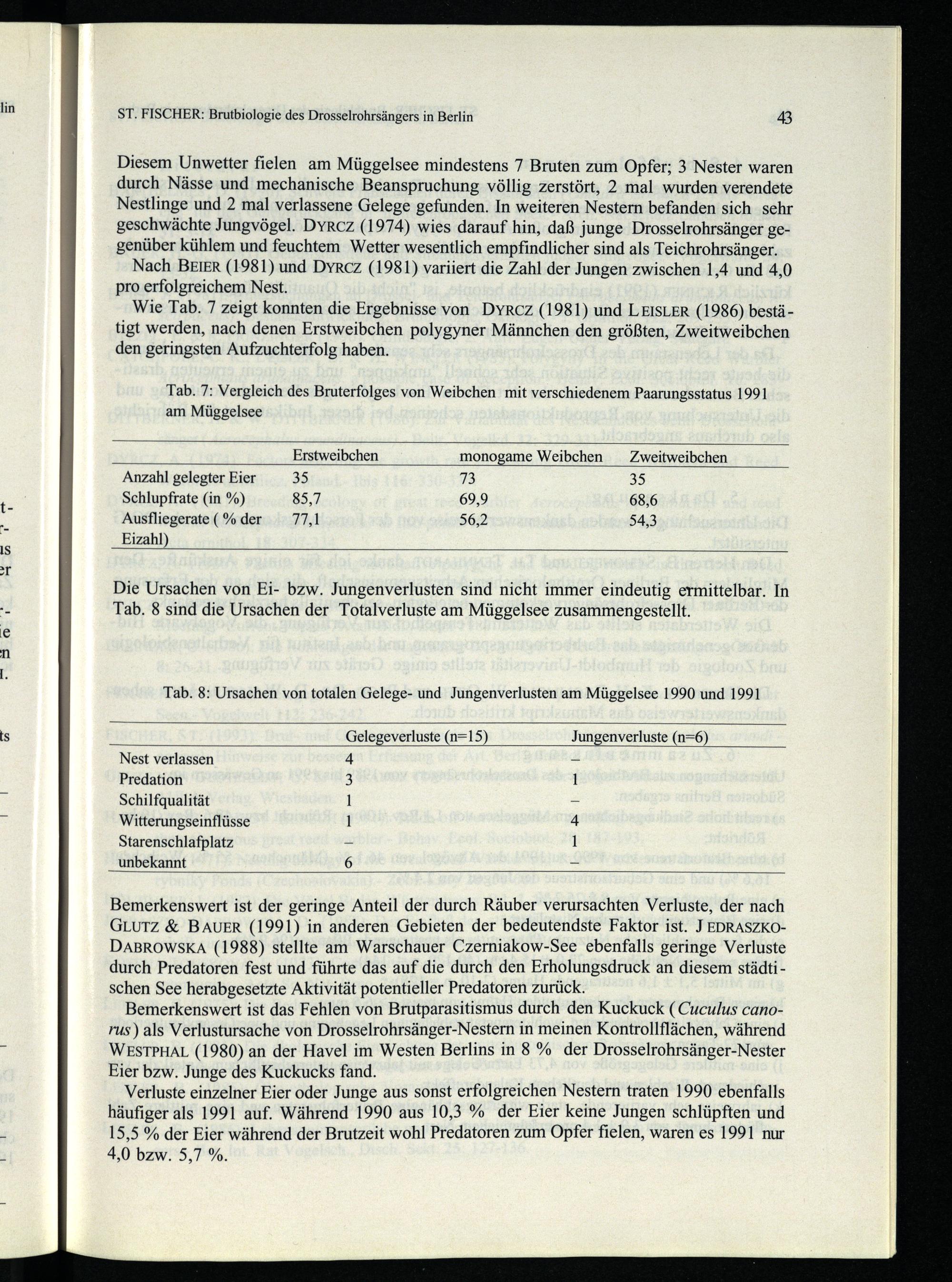 Bemerkenswert ist der geringe Anteil der durch Räuber verursachten Verluste, der nach GLUTZ& BAUER(1991) in anderen Gebieten der bedeutendste Faktor ist. J EDRASZKODABROWSKA(1988) stellte am Warschauer Czerniakow-See ebenfalls geringe Verluste durch Predatoren fest und führte das auf die durch den Erholungsdruck an diesem städtischen See herabgesetzte Aktivität potentieller Predatoren zurück.
