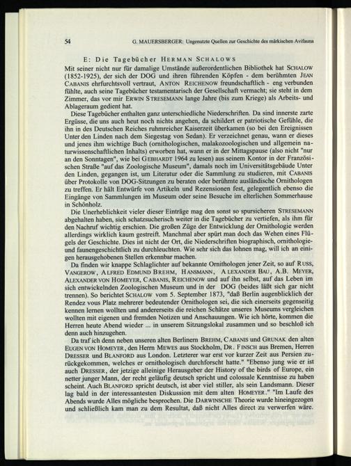 E: Die Tagebücher HERMAN SCHALOWS Mit seiner nicht nur für damalige Umstände außerordentlichen Bibliothek hat SCHALOW (1852-1925), der sich der DOG und ihren führenden Köpfen- dem berühmten JEAN CABANIS ehrfurchtsvoll vertraut, ANTON REICHENOW freundschaftlich- eng verbunden fühlte, auch seine Tagebücher testamentarisch der Gesellschaft vermacht; sie steht in dem Zimmer, das vor mir ERWIN STRESEMANN lange Jahre(bis zum Kriege) als Arbeits- und Ablageraum gedient hat.