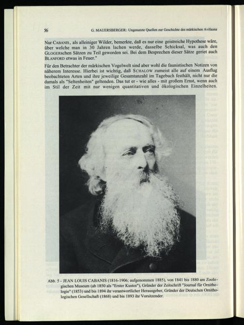 Abb. 5- JEAN LOUIS CABANIS (1816-1906; aufgenommen 1885), von 1841 bis 1880 am Zoolo gischen Museum (ab 1850 als"Erster Kustos"), Gründer der Zeitschrift"Journal für Ornithologie"(1853) und bis 1894 ihr verantwortlicher Herausgeber, Gründer der Deutschen Ornitho logischen Gesellschaft (1868) und bis 1893 ihr Vorsitzender.