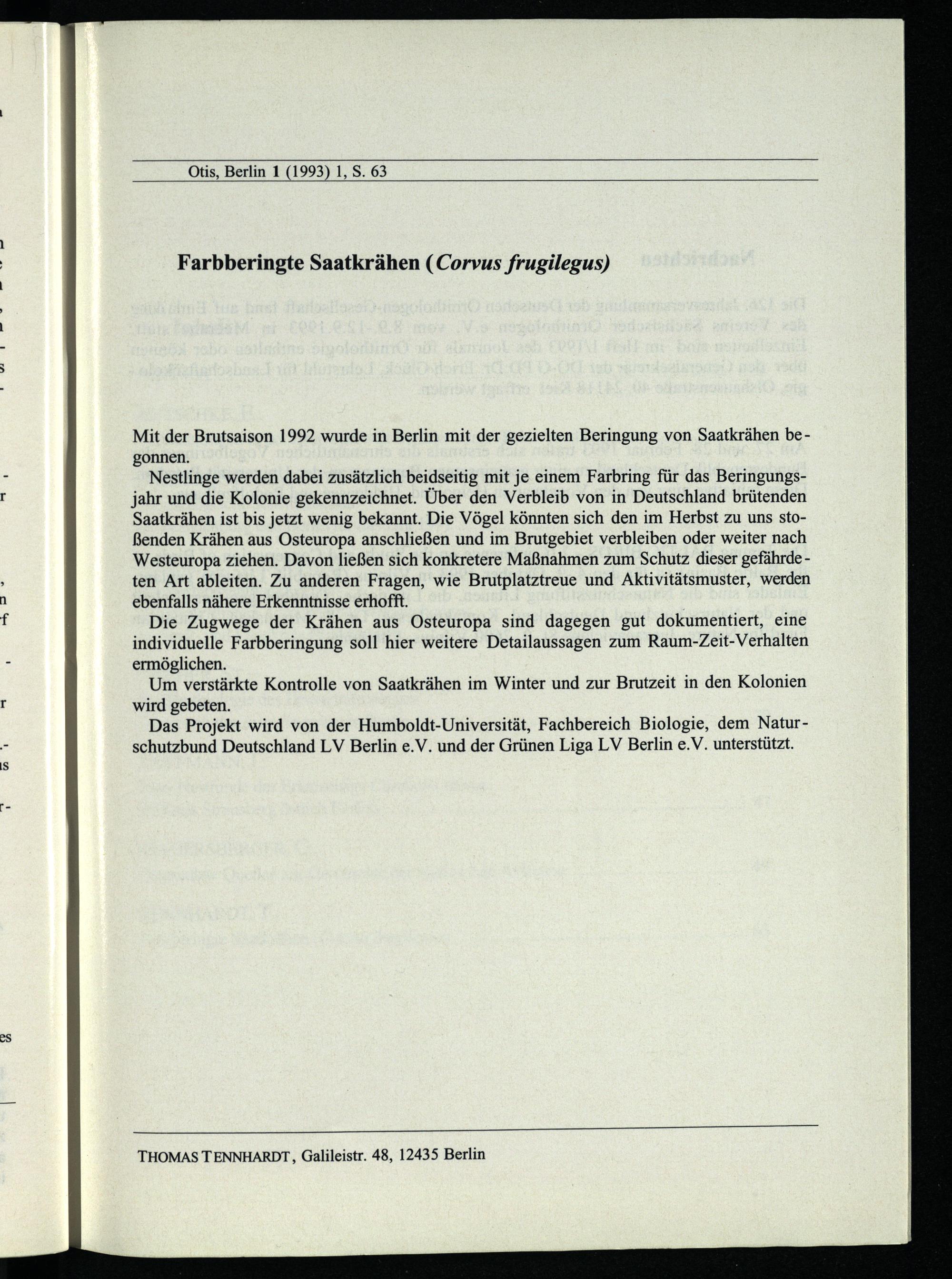 Mit der Brutsaison 1992 wurde in Berlin mit der gezielten Beringung von Saatkrähen be gonnen.