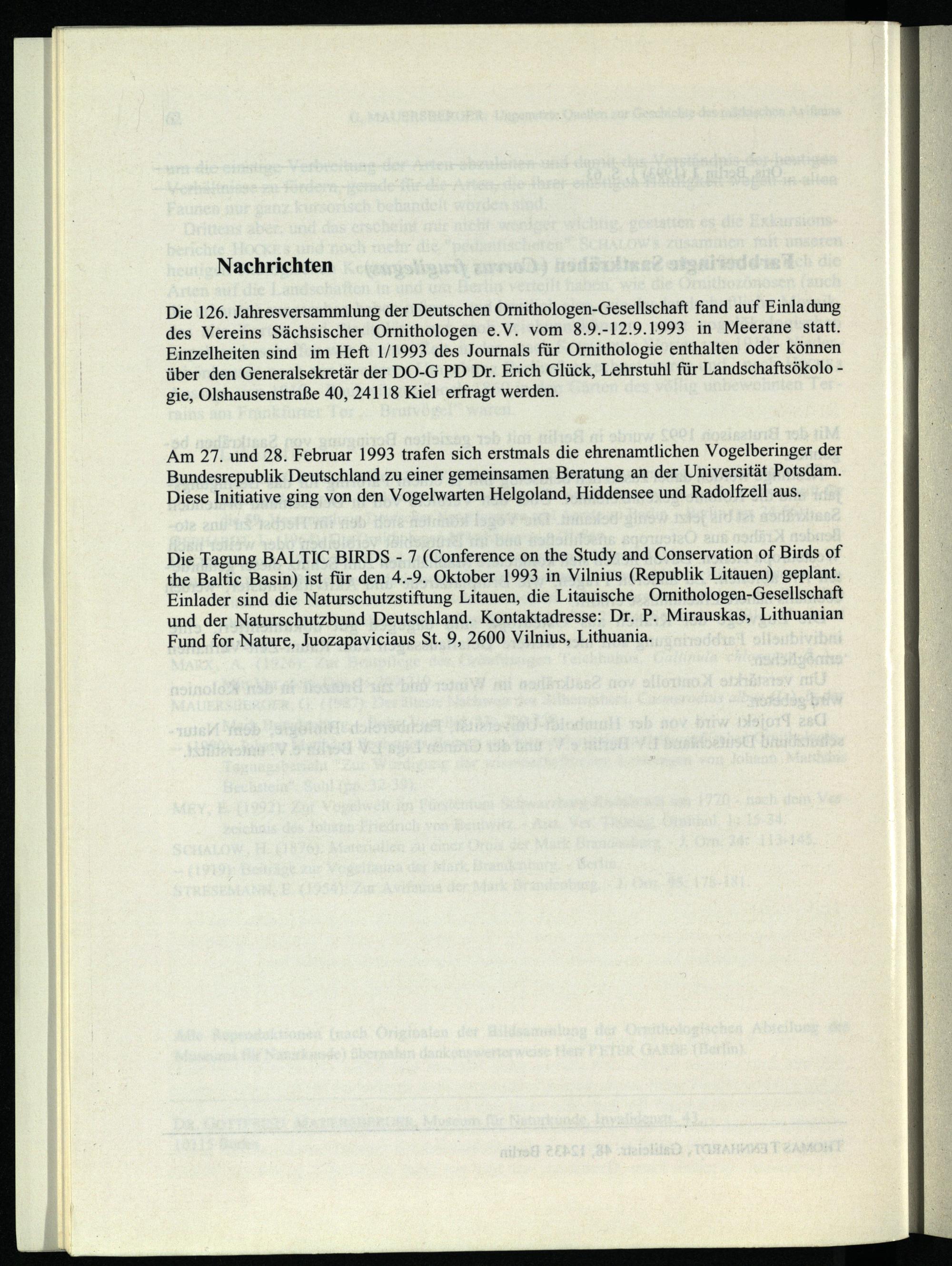 Die 126. Jahresversammlung der Deutschen Ornithologen-Gesellschaft fand auf Einla dung des Vereins Sächsischer Ornithologen e.V. vom 8.9.-12.9.1993 in Meerane statt. Einzelheiten sind im Heft 1/1993 des Journals für Ornithologie enthalten oder können über den Generalsekretär der DO-G PD Dr. Erich Glück, Lehrstuhl für Landschaftsökolo gie, Olshausenstraße 40, 24118 Kiel erfragt werden.