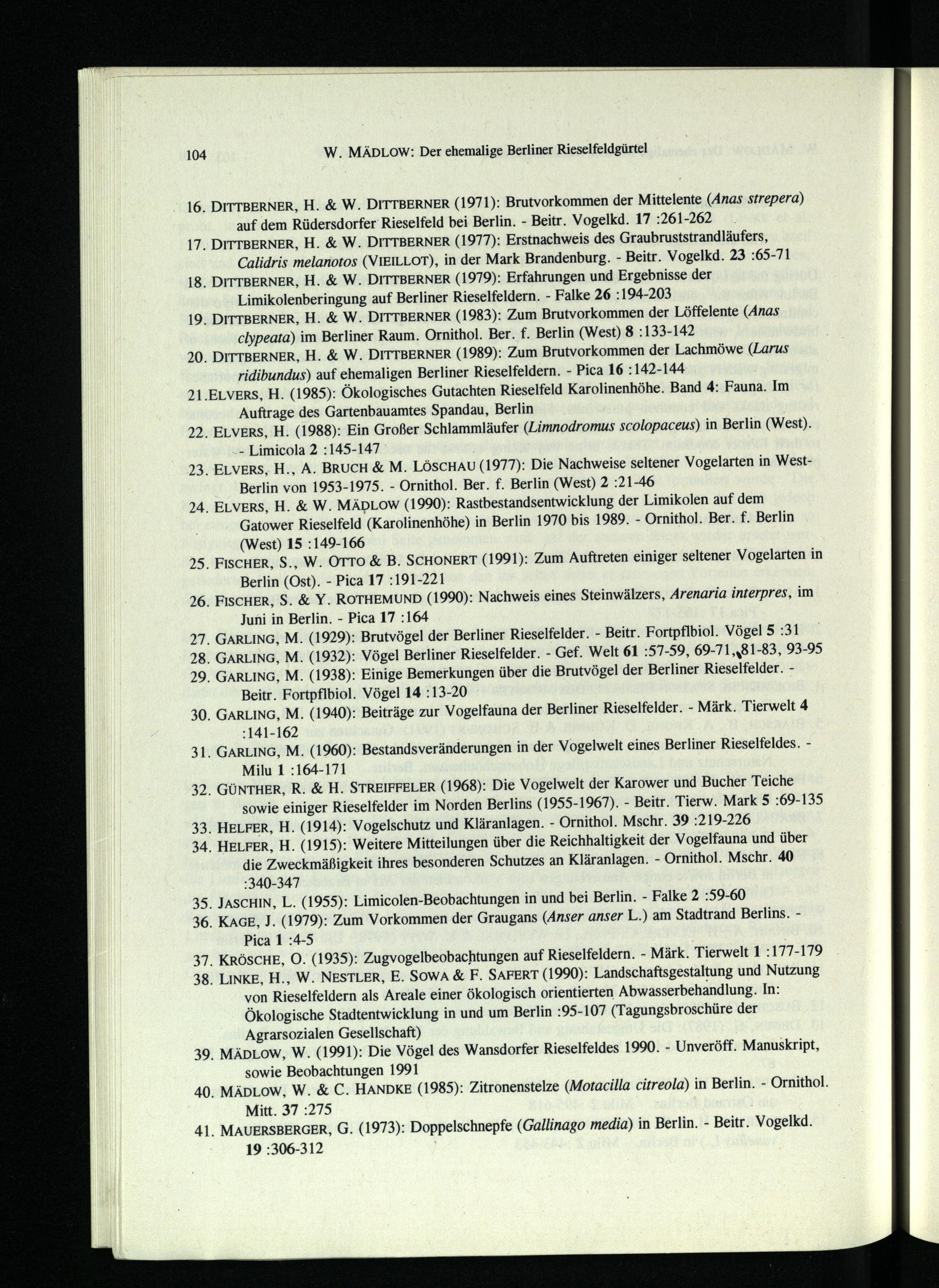16. DITTBERNER, H.& W. DITTBERNER(1971): Brutvorkommen der Mittelente(Anas strepera) auf dem Rüdersdorfer Rieselfeld bei Berlin.- Beitr. Vogelkd. 17:261-262 17. DITTBERNER, H.& W. DITTBERNER(1977): Erstnachweis des Graubruststrandläufers, Calidris melanotos(V1EILLOT), in der Mark Brandenburg.- Beitr. Vogelkd. 23:65-71 18. DITTBERNER, H.& W. DITTBERNER(1979): Erfahrungen und Ergebnisse der Limikolenberingung auf Berliner Rieselfeldern.- Falke 26:194-203 19. DITTBERNER, H.& W. DITTBERNER(1983): Zum Brutvorkommen der Löffelente(Anas clypeata) im Berliner Raum. Ornithol. Ber. f. Berlin (West) 8:133-142 20. DITTBERNER, H.& W. DITTBERNER(1989): Zum Brutvorkommen der Lachmöwe(Larus ridibundus ) auf ehemaligen Berliner Rieselfeldern.- Pica 16:142-144 21.ELVERS, H.(1985): Ökologisches Gutachten Rieselfeld Karolinenhöhe. Band 4: Fauna. Im Auftrage des Gartenbauamtes Spandau , Berlin 22. ELvERs, H.(1988): Ein Großer Schlammläufer(Limnodromus scolopaceus) in Berlin (West). - Limicola 2:145-147 23. ELVERS, H., A. BRUCH& M. LÖSCHAU(1977): Die Nachweise seltener Vogelarten in West Berlin von 1953-1975.- Ornithol. Ber. f. Berlin (West) 2:21-46 24. ELVERS, H.& W. MÄDLOW(1990): Rastbestandsentwicklung der Limikolen auf dem Gatower Rieselfeld(Karolinenhöhe) in Berlin 1970 bis 1989.- Ornithol. Ber. f. Berlin (West) 15:149-166 _ FISCHER, S., W. OTTO& B. SCHONERT(1991): Zum Auftreten einiger seltener Vogelarten in Berlin (Ost).- Pica 17:191-221 . FISCHER, S.& Y. ROTHEMUND(1990): Nachweis eines Steinwälzers, Arenaria interpres, im Juni in Berlin. - Pica 17:164 . GARLING, M.(1929): Brutvögel der Berliner Rieselfelder.- Beitr. Fortpflbiol. Vögel 5:31 _ GARLING, M.(1932): Vögel Berliner Rieselfelder.- Gef. Welt 61:57-59, 69-71 ,,81-83, 93-95 _ GARLING, M.(1938): Einige Bemerkungen über die Brutvögel der Berliner Rieselfelder. Beitr. Fortpflbiol. Vögel 14:13-20 _ GARLING, M.(1940): Beiträge zur Vogelfauna der Berliner Rieselfelder.- Märk. Tierwelt 4 :141-162 _ GARLING, M.(1960): Bestandsveränderungen in der Vogelwelt eines Berliner Rieselfeldes. Milu 1:164-171 . GÜNTHER, R.& H. STREIFFELER(1968): Die Vogelwelt der Karower und Bucher Teiche sowie einiger Rieselfelder im Norden Berlins (1955-1967).- Beitr. Tierw. Mark 5:69-135 _ HELFER, H.(1914): Vogelschutz und Kläranlagen.- Ornithol. Mschr. 39:219-226 . HELFER, H.(1915): Weitere Mitteilungen über die Reichhaltigkeit der Vogelfauna und über die Zweckmäßigkeit ihres besonderen Schutzes an Kläranlagen.- Ornithol. Mschr. 40 :340-347 . JASCHIN , L.(1955): Limicolen-Beobachtungen in und bei Berlin.- Falke 2:59-60 . KAGE, J.(1979): Zum Vorkommen der Graugans(Anser anser L.) am Stadtrand Berlins . Pica 1:4-5 _ KRÖSCHE, O.(1935): Zugvogelbeobachtungen auf Rieselfeldern.- Märk. Tierwelt 1:177-179 . LINKE, H., W. NESTLER, E. SOWA& F. SAFERT(1990): Landschaftsgestaltung und Nutzung von Rieselfeldern als Areale einer ökologisch orientierten Abwasserbehandlung. In: Ökologische Stadtentwicklung in und um Berlin :95-107(Tagungsbroschüre der Agrarsozialen Gesellschaft) . MÄDLOW, W.(1991): Die Vögel des Wansdorfer Rieselfeldes 1990.- Unveröff. Manuskript, sowie Beobachtungen 1991 _ MÄDLOW, W.& C. HANDKE(1985): Zitronenstelze(Motacilla citreola) in Berlin .- Ornithol. Mitt. 37:275 _ MAUERSBERGER, G.(1973): Doppelschnepfe(Gallinago media) in Berlin .- Beitr. Vogelkd. 19:306-312