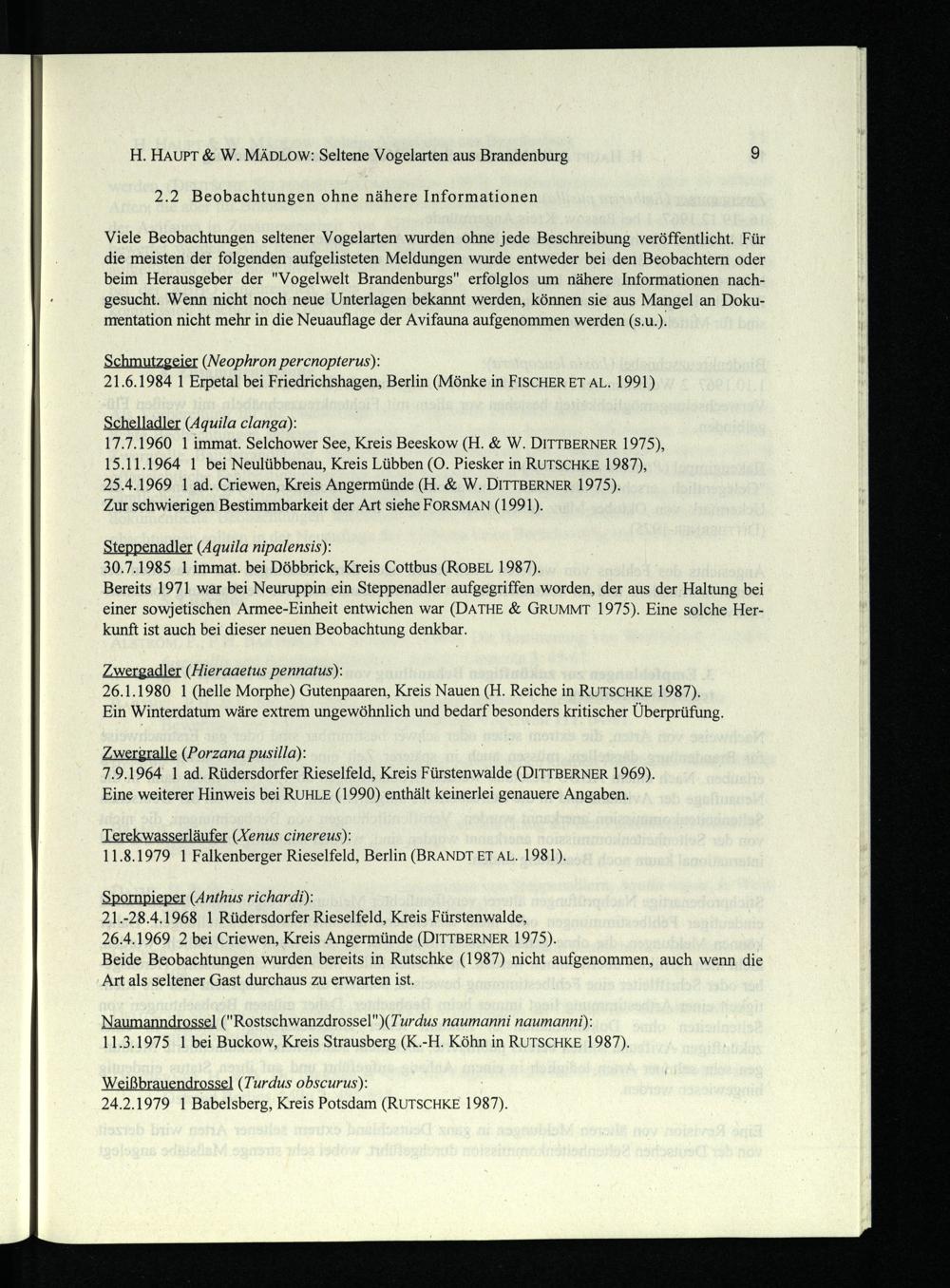Viele Beobachtungen seltener Vogelarten wurden ohne jede Beschreibung veröffentlicht. Für die meisten der folgenden aufgelisteten Meldungen wurde entweder bei den Beobachtern oder beim Herausgeber der"Vogelwelt Brandenburgs" erfolglos um nähere Informationen nachgesucht. Wenn nicht noch neue Unterlagen bekannt werden, können sie aus Mangel an Dokumentation nicht mehr in die Neuauflage der Avifauna aufgenommen werden(s.u.).