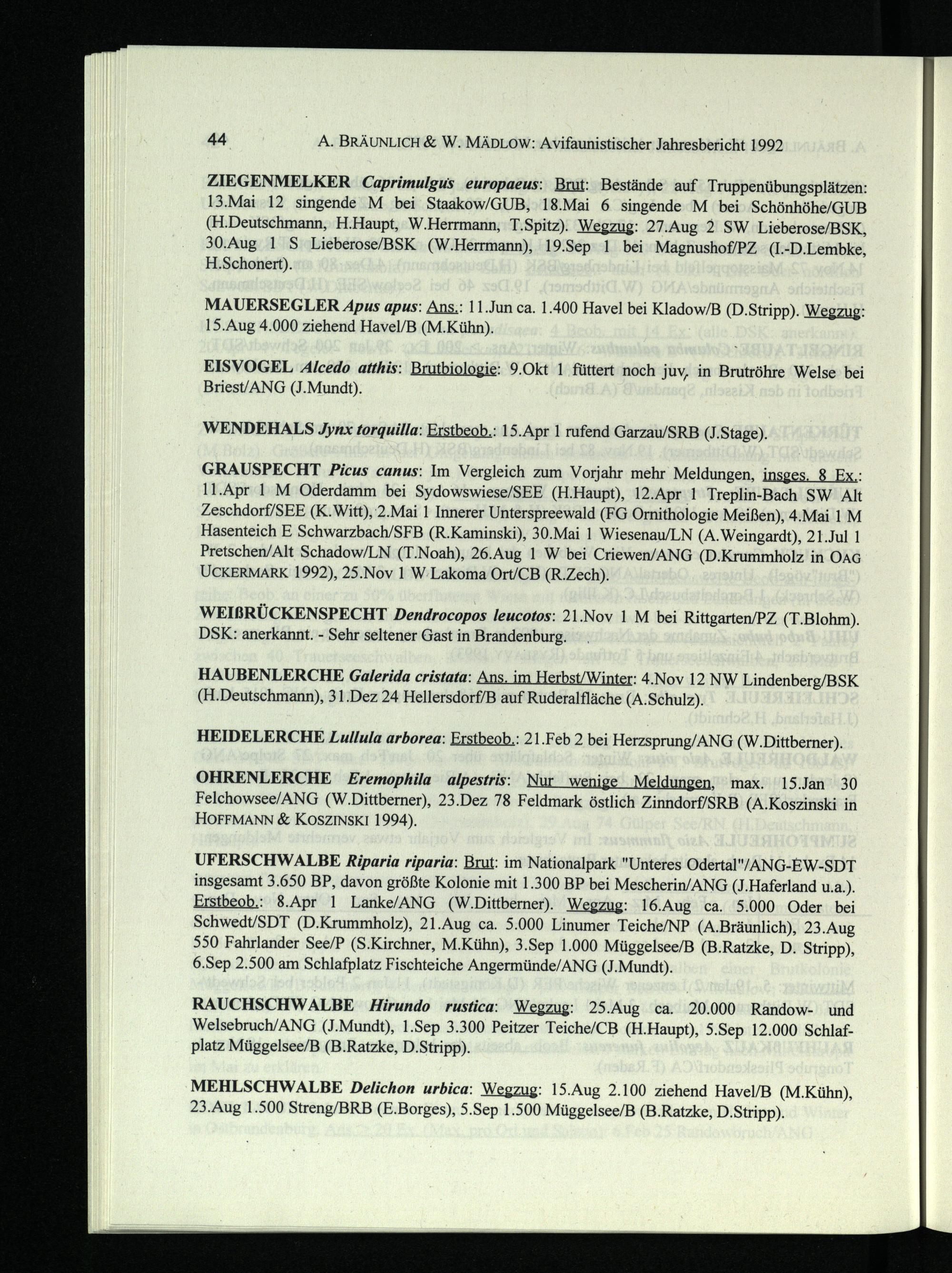 44 A. BRÄUNLICH& W. MÄDLOW: Avifaunistischer Jahresbericht 1992
