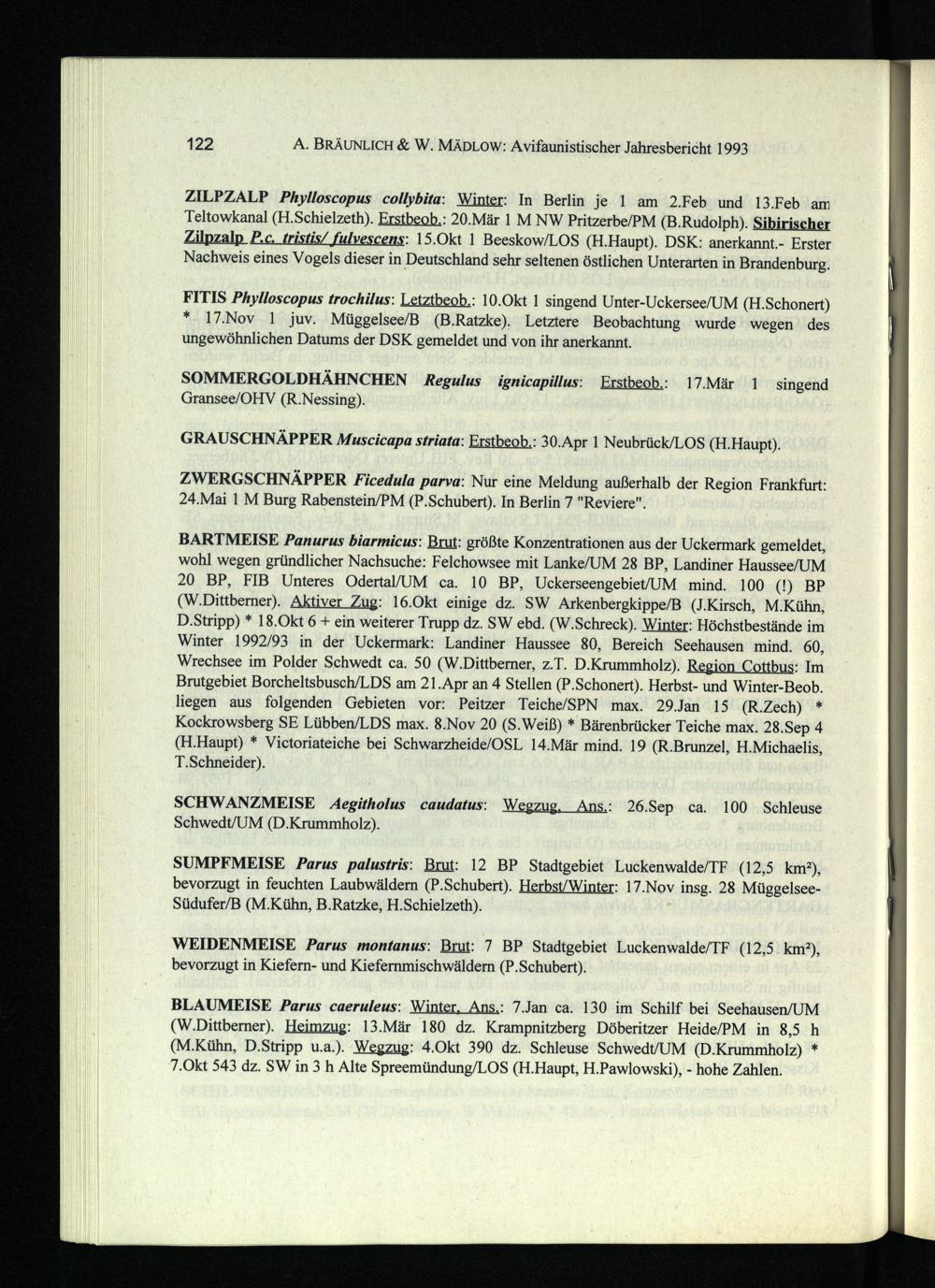122 A. BRÄUNLICH& W. MÄDLOW: Avifaunistischer Jahresbericht 1993