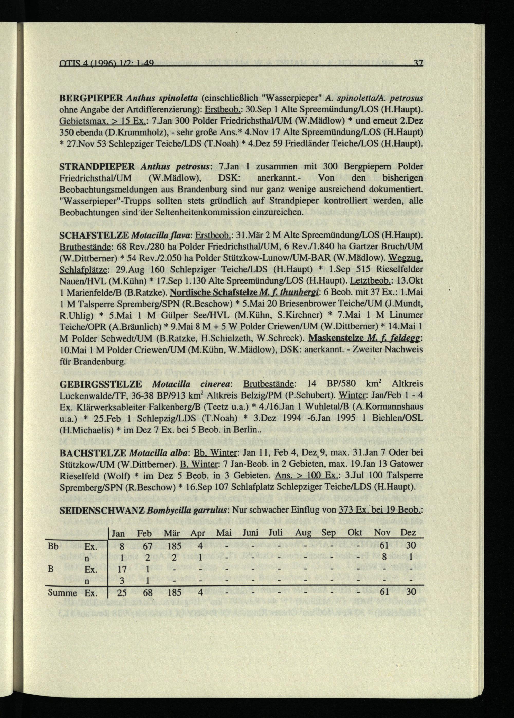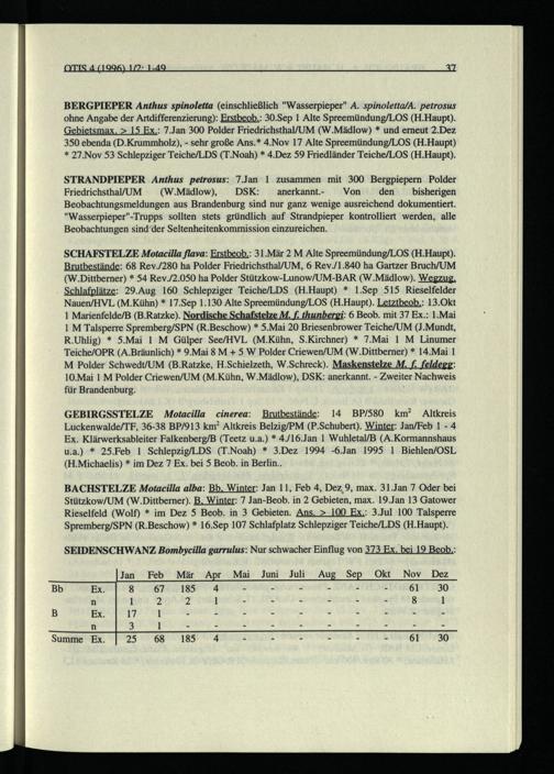 GEBIRGSSTELZE Motacilla cinerea : Brutbestände: 14 BP/580 km? Altkreis Luckenwalde/TF, 36-38 BP/913 km? Altkreis Belzig/PM (P.Schubert). Winter: Jan/Feb 1- 4 Ex. Klärwerksableiter Falkenberg/B(Teetz u.a.)* 4./16.Jan 1 Wuhletal/B(A.Kormannshaus u.a.)* 25.Feb 1 Schlepzig/LDS (T.Noah)* 3.Dez 1994-6.Jan 1995 1 Biehlen/OSL (H.Michaelis)* im Dez 7 Ex. bei 5 Beob. in Berlin ..