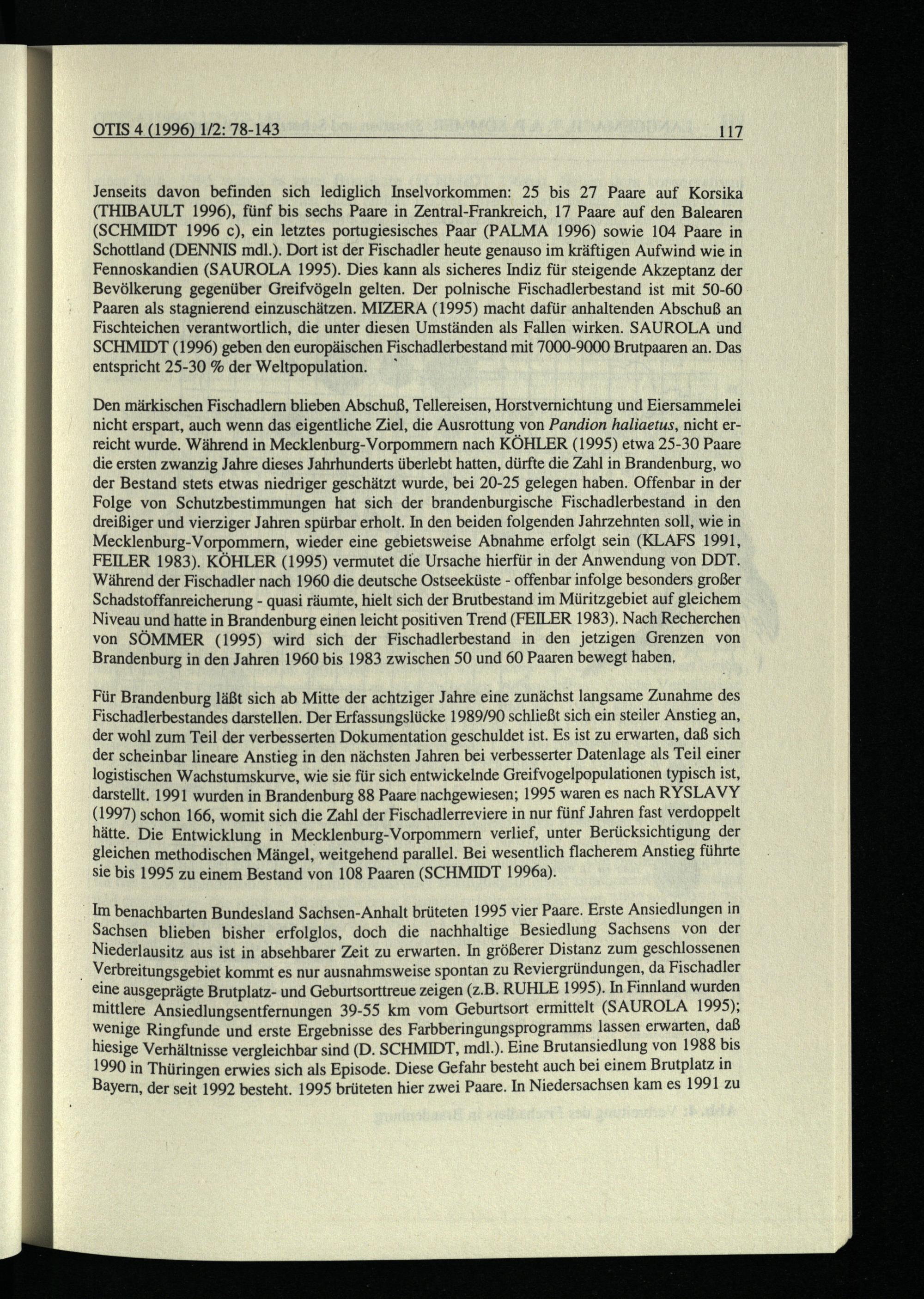 Jenseits davon befinden sich lediglich Inselvorkommen: 25 bis 27 Paare auf Korsika (THIBAULT 1996), fünf bis sechs Paare in Zentral-Frankreich, 17 Paare auf den Balearen (SCHMIDT 1996 c), ein letztes portugiesisches Paar(PALMA 1996) sowie 104 Paare in Schottland (DENNIS mdl.). Dort ist der Fischadler heute genauso im kräftigen Aufwind wie in Fennoskandien(SAUROLA 1995). Dies kann als sicheres Indiz für steigende Akzeptanz der Bevölkerung gegenüber Greifvögeln gelten. Der polnische Fischadlerbestand ist mit 50-60 Paaren als stagnierend einzuschätzen. MIZERA(1995) macht dafür anhaltenden Abschuß an Fischteichen verantwortlich, die unter diesen Umständen als Fallen wirken. SAUROLA und SCHMIDT(1996) geben den europäischen Fischadlerbestand mit 7000-9000 Brutpaaren an. Das entspricht 25-30% der Weltpopulation.