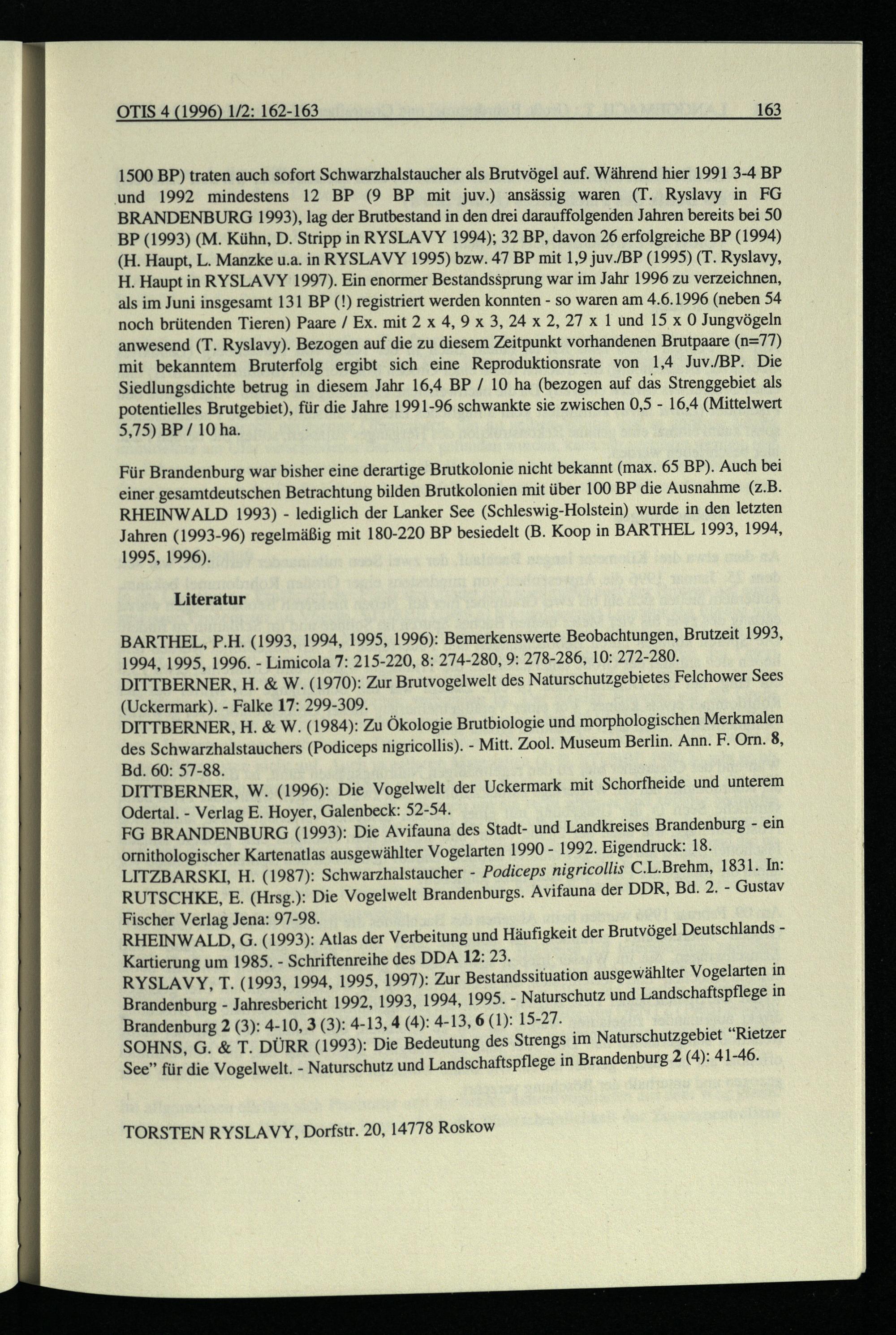 1500 BP) traten auch sofort Schwarzhalstaucher als Brutvögel auf. Während hier 1991 3-4 BP und 1992 mindestens 12 BP(9 BP mit juv.) ansässig waren(T. Ryslavy in FG BRANDENBURG 19923), lag der Brutbestand in den drei darauffolgenden Jahren bereits bei 50 BP(1993)(M. Kühn, D. Stripp in RYSLAVY 1994); 32 BP, davon 26 erfolgreiche BP(1994) (H. Haupt, L. Manzke u.a. in RYSLAVY 1995) bzw. 47 BP mit 1,9 juv./BP(1995)(T. Ryslavy, H. Haupt in RYSLAVY 1997). Ein enormer Bestandssprung war im Jahr 1996 zu verzeichnen, als im Juni insgesamt 131 BP(!) registriert werden konnten- so waren am 4.6.1996(neben 54 noch brütenden Tieren) Paare/ Ex. mit 2 x 4,9 x 3, 24 x 2, 27 x 1 und 15 x 0 Jungvögeln anwesend(T. Ryslavy). Bezogen auf die zu diesem Zeitpunkt vorhandenen Brutpaare(n=77) mit bekanntem Bruterfolg ergibt sich eine Reproduktionsrate von 1,4 Juv./BP. Die Siedlungsdichte betrug in diesem Jahr 16,4 BP/ 10 ha(bezogen auf das Strenggebiet als potentielles Brutgebiet), für die Jahre 1991-96 schwankte sie zwischen 0,5- 16,4(Mittelwert 5,75) BP/ 10 ha.