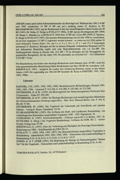 RHEINWALD, G.(1993): Atlas der Verbeitung und Häufigkeit der Brutvögel Deutschlands Kartierung um 1985.- Schriftenreihe des DDA 12:23.. RYSLAVY, T.(1993, 1994, 1995, 1997): Zur Bestandssituation ausgewählter Vogelarten in Brandenburg - Jahresbericht 1992, 1993, 1994, 1995.- Naturschutz und Landschaftspflege in Brandenburg 2(3): 4-10, 3(3): 4-13, 4(4): 4-13, 6(1): 15-27. er SOHNS, G.& T. DÜRR(1993): Die Bedeutung des Strengs im Naturschutzgebiet“Rietzer See” für die Vogelwelt.- Naturschutz und Landschaftspflege in Brandenburg 2(4): 41-46.