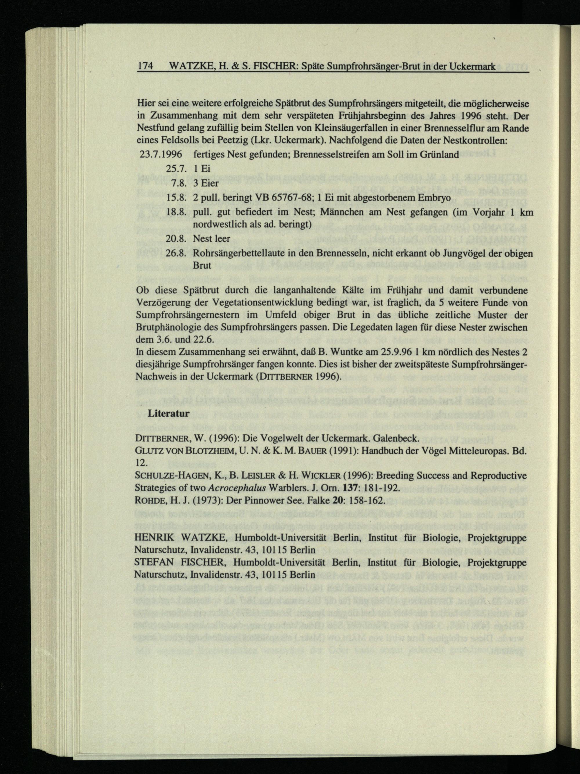 In diesem Zusammenhang sei erwähnt, daß B. Wuntke am 25.9.96 1 km nördlich des Nestes 2 diesjährige Sumpfrohrsänger fangen konnte. Dies ist bisher der zweitspäteste SumpfrohrsängerNachweis in der Uckermark (DITTBERNER 1996).