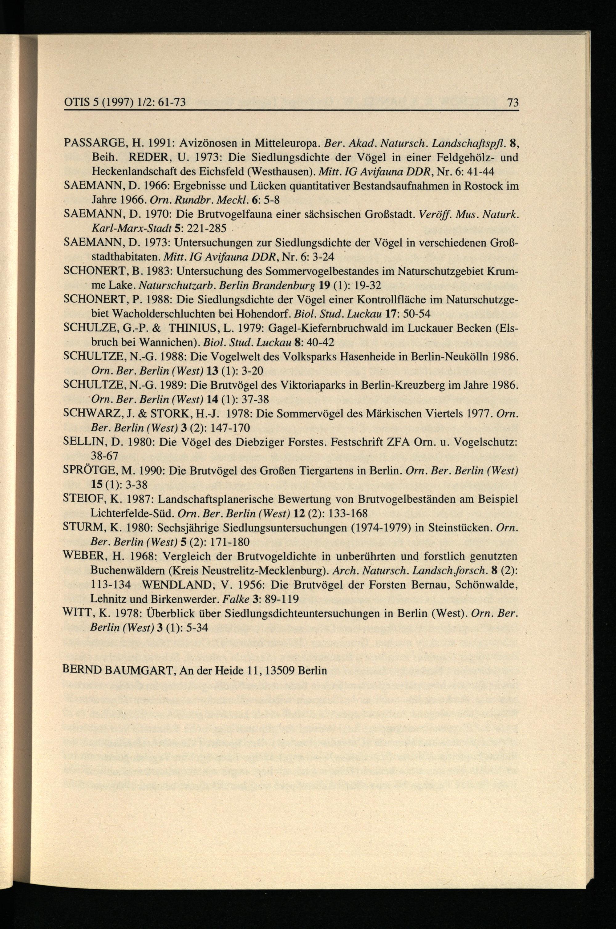 SAEMANN, D. 1973: Untersuchungen zur Siedlungsdichte der Vögel in verschiedenen Großstadthabitaten. Mitt. IG Avifauna DDR , Nr. 6: 3-24