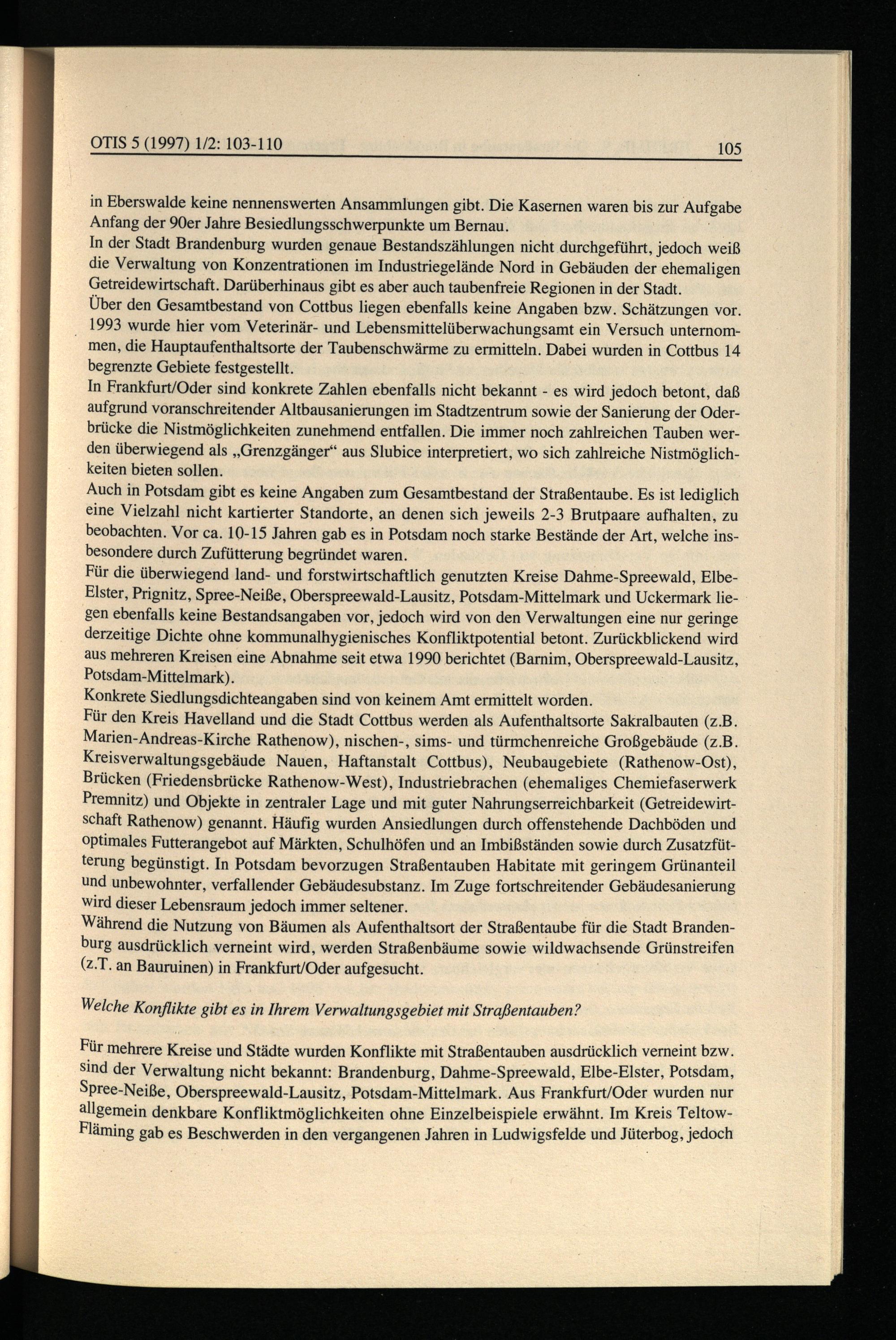 in Eberswalde keine nennenswerten Ansammlungen gibt. Die Kasernen waren bis zur Aufgabe Anfang der 90er Jahre Besiedlungsschwerpunkte um Bernau.: In der Stadt Brandenburg wurden genaue Bestandszählungen nicht durchgeführt, jedoch weiß die Verwaltung von Konzentrationen im Industriegelände Nord in Gebäuden der ehemaligen Getreidewirtschaft. Darüberhinaus gibt es aber auch taubenfreie Regionen in der Stadt. Über den Gesamtbestand von Cottbus liegen ebenfalls keine Angaben bzw. Schätzungen vor. 1993 wurde hier vom Veterinär- und Lebensmittelüberwachungsamt ein Versuch unternommen, die Hauptaufenthaltsorte der Taubenschwärme zu ermitteln. Dabei wurden in Cottbus 14 begrenzte Gebiete festgestellt. In Frankfurt/Oder sind konkrete Zahlen ebenfalls nicht bekannt- es wird jedoch betont, daß aufgrund voranschreitender Altbausanierungen im Stadtzentrum sowie der Sanierung der Oderbrücke die Nistmöglichkeiten zunehmend entfallen. Die immer noch zahlreichen Tauben werden überwiegend als„Grenzgänger“ aus Slubice interpretiert, wo sich zahlreiche Nistmöglichkeiten bieten sollen. Auch in Potsdam gibt es keine Angaben zum Gesamtbestand der Straßentaube. Es ist lediglich eine Vielzahl nicht kartierter Standorte, an denen sich jeweils 2-3 Brutpaare aufhalten, zu beobachten. Vor ca. 10-15 Jahren gab es in Potsdam noch starke Bestände der Art, welche insbesondere durch Zufütterung begründet waren. Für die überwiegend land- und forstwirtschaftlich genutzten Kreise Dahme-Spreewald , ElbeElster, Prignitz , Spree-Neiße , Oberspreewald-Lausitz , Potsdam-Mittelmark und Uckermark liegen ebenfalls keine Bestandsangaben vor, jedoch wird von den Verwaltungen eine nur geringe derzeitige Dichte ohne kommunalhygienisches Konfliktpotential betont. Zurückblickend wird aus mehreren Kreisen eine Abnahme seit etwa 1990 berichtet(Barnim , Oberspreewald-Lausitz , Potsdam-Mittelmark ). Konkrete Siedlungsdichteangaben sind von keinem Amt ermittelt worden. Für den Kreis Havelland und die Stadt Cottbus werden als Aufenthaltsorte Sakralbauten(z.B. Marien-Andreas-Kirche Rathenow ), nischen-, sims- und türmchenreiche Großgebäude(z.B. Kreisverwaltungsgebäude Nauen, Haftanstalt Cottbus), Neubaugebiete(Rathenow-Ost), Brücken(Friedensbrücke Rathenow-West), Industriebrachen(ehemaliges Chemiefaserwerk Premnitz ) und Objekte in zentraler Lage und mit guter Nahrungserreichbarkeit(Getreidewirtschaft Rathenow ) genannt. Häufig wurden Ansiedlungen durch offenstehende Dachböden und optimales Futterangebot auf Märkten, Schulhöfen und an Imbißständen sowie durch Zusatzfütterung begünstigt. In Potsdam bevorzugen Straßentauben Habitate mit geringem Grünanteil und unbewohnter, verfallender Gebäudesubstanz. Im Zuge fortschreitender Gebäudesanierung wird dieser Lebensraum jedoch immer seltener. Während die Nutzung von Bäumen als Aufenthaltsort der Straßentaube für die Stadt Branden burg ausdrücklich verneint wird, werden Straßenbäume sowie wildwachsende Grünstreifen (z.T. an Bauruinen) in Frankfurt/Oder aufgesucht.