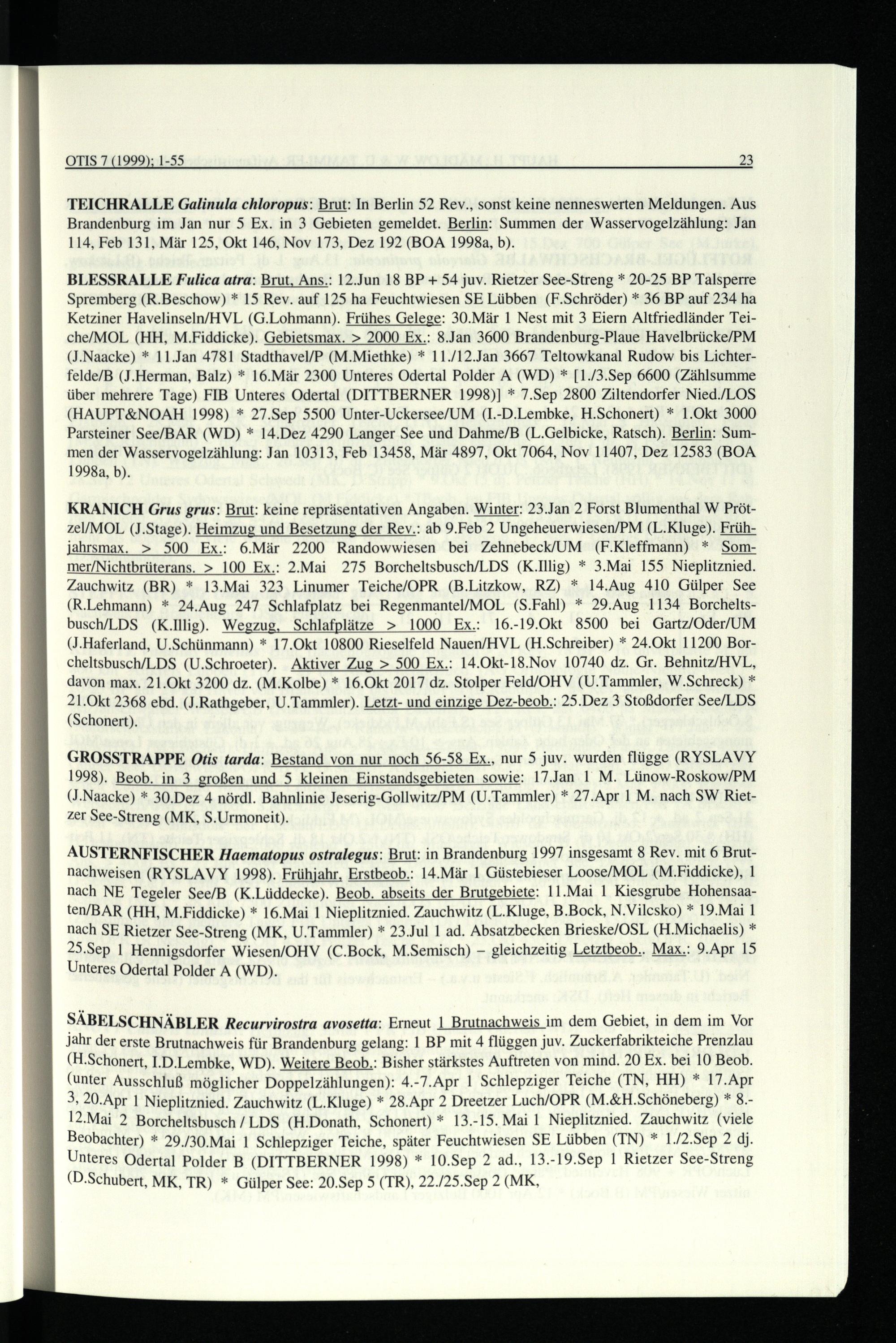 BLESSRALLE Fulica atra: Brut, Ans.: 12.Jun 18 BP+ 54 juv. Rietzer See-Streng* 20-25 BP Talsperre Spremberg(R.Beschow)* 15 Rev. auf 125 ha Feuchtwiesen SE Lübben(F.Schröder)* 36 BP auf 234 ha Ketziner Havelinseln/HVL (G.Lohmann). Frühes Gelege: 30.Mär 1 Nest mit 3 Eiern Altfriedländer Teiche/MOL(HH , M.Fiddicke). Gebietsmax.> 2000 Ex.: 8.Jan 3600 Brandenburg-Plaue Havelbrücke/PM (J.Naacke)* 11.Jan 4781 Stadthavel/P(M.Miethke)* 11./12.Jan 3667 Teltowkanal Rudow bis Lichter felde/B (J.Herman, Balz)* 16.Mär 2300 Unteres Odertal Polder A(WD)*[1./3.Sep 6600(Zählsumme über mehrere Tage) FIB Unteres Odertal(DITTBERNER 1998)]* 7.Sep 2800 Ziltendorfer Nied. /LOS (HAUPT&NOAH 1998)* 27.Sep 5500 Unter-Uckersee/UM(I.-D.Lembke, H.Schonert)* 1.Okt 3000 Parsteiner See/BAR(WD)* 14.Dez 4290 Langer See und Dahme/B (L.Gelbicke, Ratsch). Berlin : Summen der Wasservogelzählung: Jan 10313, Feb 13458, Mär 4897, Okt 7064, Nov 11407, Dez 12583(BOA 1998a, b).