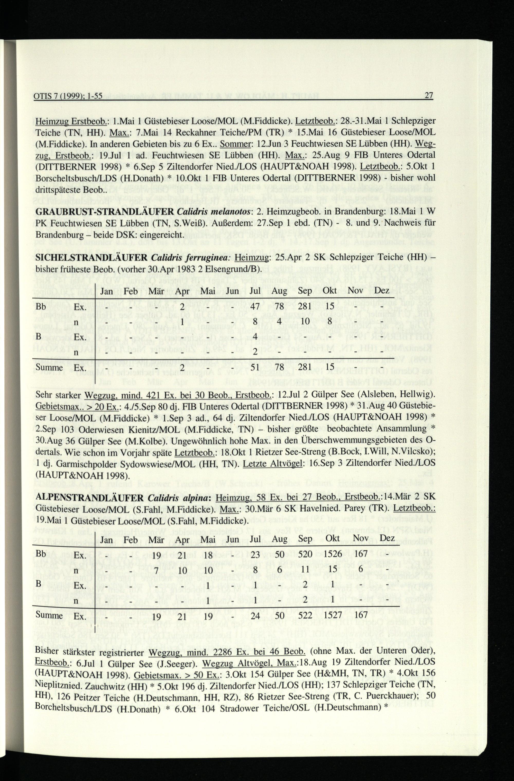 ALPENSTRANDLÄUFER Calidris alpina : Heimzug, 58 Ex. bei 27 Beob., Erstbeob.:14.Mär 2 SK Güstebieser Loose/MOL(S.Fahl, M.Fiddicke). Max.: 30.Mär 6 SK Havelnied. Parey (TR). Letztbeob.: 19.Mai 1 Güstebieser Loose/MOL(S.Fahl, M.Fiddicke).