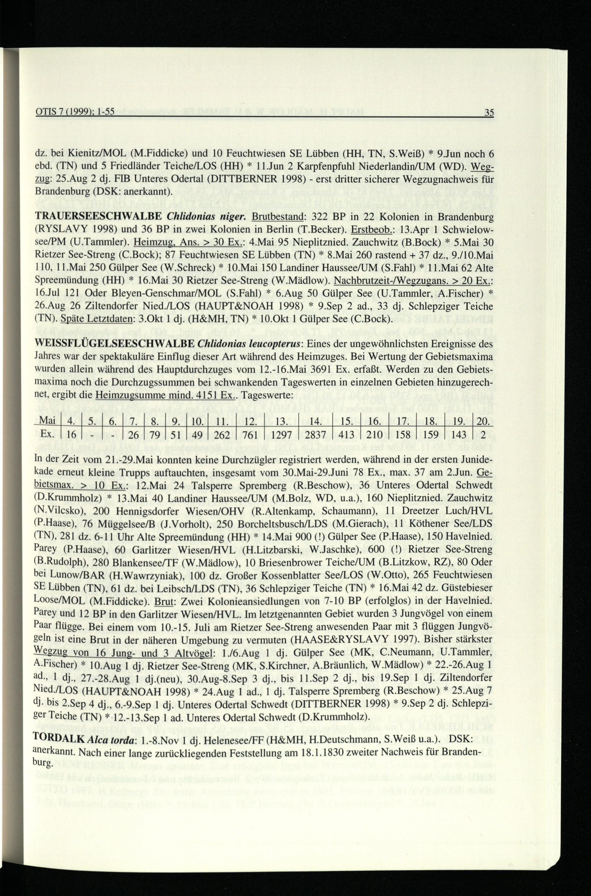 TRAUERSEESCHWALBE Chlidonias niger. Brutbestand: 322 BP in 22 Kolonien in Brandenburg (RYSLAVY 1998) und 36 BP in zwei Kolonien in Berlin (T.Becker). Erstbeob.: 13.Apr 1 Schwielowsee/PM(U.Tammler). Heimzug, Ans.> 30 Ex.: 4.Mai 95 Nieplitznied. Zauchwitz (B.Bock)* 5.Mai 30 Rietzer See-Streng(C.Bock); 87 Feuchtwiesen SE Lübben(TN)* 8.Mai 260 rastend+ 37 dz., 9./10.Mai 110, 11.Mai 250 Gülper See(W.Schreck)* 10.Mai 150 Landiner Haussee/UM(S.Fahl)* 11.Mai 62 Alte Spreemündung(HH )* 16.Mai 30 Rietzer See-Streng(W.Mädlow). Nachbrutzeit-/Wegzugans.> 20 Ex.: 16.Jul 121 Oder Bleyen-Genschmar/MOL (S.Fahl)* 6.Aug 50 Gülper See(U.Tammler, A.Fischer)* 26.Aug 26 Ziltendorfer Nied. /LOS(HAUPT&NOAH 1998)* 9.Sep 2 ad., 33 dj. Schlepziger Teiche (TN). Späte Letztdaten: 3.Okt 1 dj.(H&MH, TN)* 10.Okt 1 Gülper See(C.Bock).