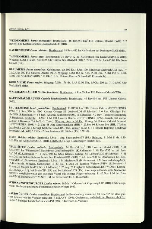 BEUTELMEISE Remiz pendulinus: Brutbestand: 30 BP/54 km? FIB Unteres Odertal(DITTBERNER 1999)* 8 Rev./350 ha NSG Kleines Gehege SE Lübben/LDS (F.Schröder)* 6 Rev. Glinziger TeiChe/SPN (S.Rasehorn)* 4-5 Rev. Altkreis Senftenberg/OSL (T.Schneider)* 3 Rev. Talsperre Spremberg (R.Beschow). Erstbeob.: 11.Mär 1 M FIB Unteres Odertal(DITTBERNER 1999), danach erst wieder 22.Mär 1 Karower Teiche/B(H.Teetz). Wegzug, Ans.> 30 Ex.: 19.Aug 64 Unteres Odertal Schwedt (DITTBERNER 1998)* 21.Sep 48 Alte Spreemündung(HH )* 27.Sep 90 Rietzer See(HH , I.Todte). Letztbeob.: 22.Okt 1 beringt Köthener See/LDS (TN). Winter: 8.Jan 6+ 1 frische Rupfung Blindower Seebruch/UM(WD)* 23.Dez 2 Feuchtwiesen SE Lübben(TN, S.Weiß).
