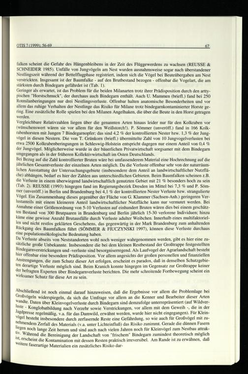 falken scheint die Gefahr des Hängenbleibens in der Zeit des Flüggewerdens zu wachsen(REUSSE& SCHNEIDER 1985). Unfälle von Jungvögeln am Nest wurden ausnahmsweise sogar nach überstandener Nestlingszeit während der Bettelflugphase registriert, indem sich die Vögel bei Beuteübergaben am Nest verstrickten. Insgesamt ist der Baumfalke - auf den Brutbestand bezogen- offenbar die Vogelart, die am stärksten durch Bindegarn gefährdet ist(Tab. 1).