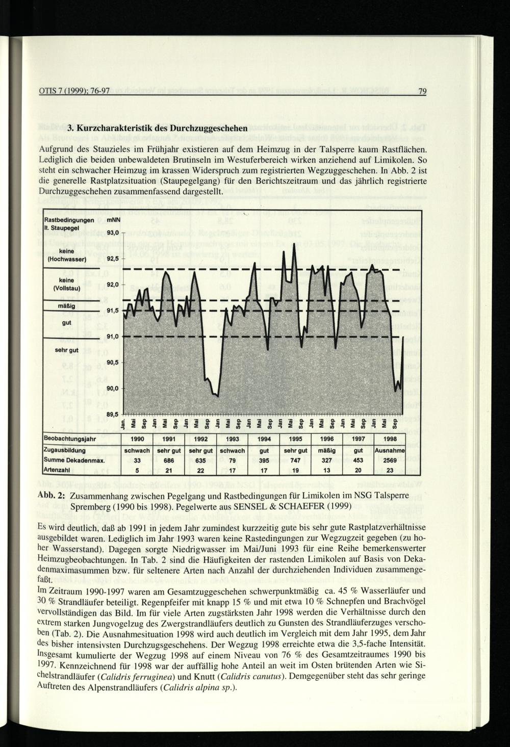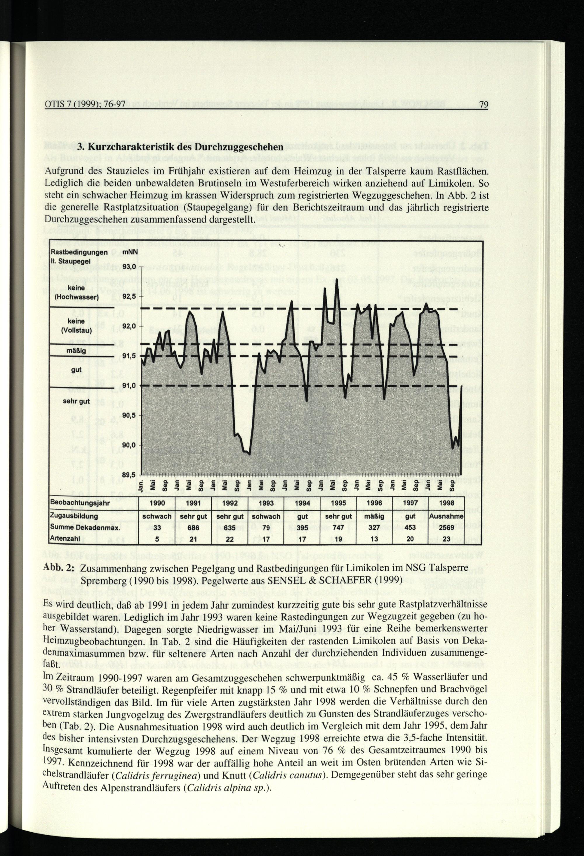 Es wird deutlich, daß ab 1991 in jedem Jahr zumindest kurzzeitig gute bis sehr gute Rastplatzverhältnisse ausgebildet waren. Lediglich im Jahr 1993 waren keine Rastedingungen zur Wegzugzeit gegeben(zu hoher Wasserstand). Dagegen sorgte Niedrigwasser im Mai/Juni 1993 für eine Reihe bemerkenswerter Heimzugbeobachtungen. In Tab. 2 sind die Häufigkeiten der rastenden Limikolen auf Basis von Deka $enmaximasummen bzw. für seltenere Arten nach Anzahl der durchziehenden Individuen zusammengeaßt.