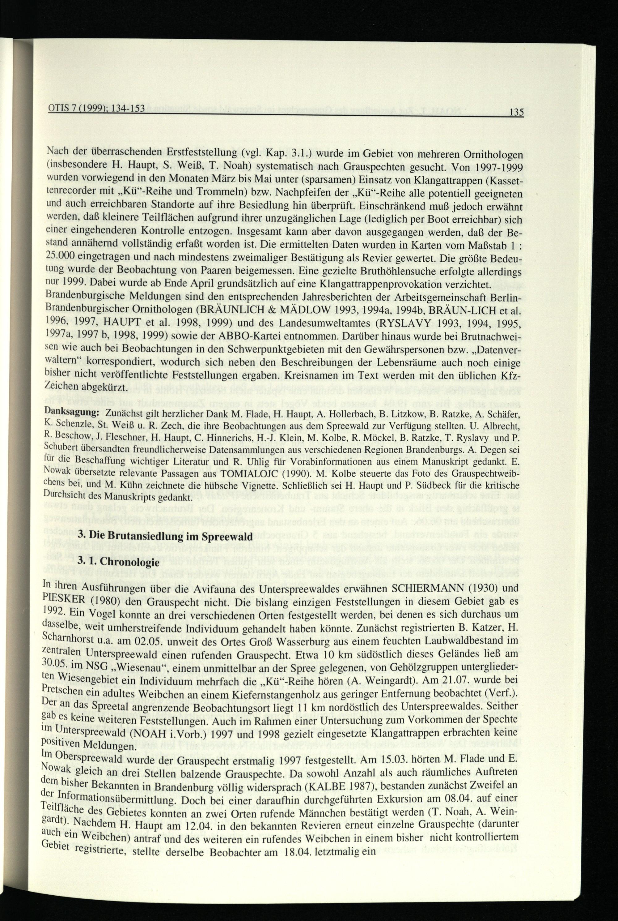 Danksagung: Zunächst gilt herzlicher Dank M. Flade, H. Haupt, A. Hollerbach, B. Litzkow, B. Ratzke, A. Schäfer, K. Schenzle, St. Weiß u. R. Zech, die ihre Beobachtungen aus dem Spreewald zur Verfügung stellten. U. Albrecht, R. Beschow, J. Fleschner, H. Haupt, C. Hinnerichs, H.-J. Klein, M. Kolbe, R. Möckel, B. Ratzke, T. Ryslavy und P. Schubert übersandten freundlicherweise Datensammlungen aus verschiedenen Regionen Brandenburgs . A. Degen sei für die Beschaffung wichtiger Literatur und R. Uhlig für Vorabinformationen aus einem Manuskript gedankt. E. Nowak übersetzte relevante Passagen aus TOMIALOJC(1990). M. Kolbe steuerte das Foto des GrauspechtweibChens bei, und M. Kühn zeichnete die hübsche Vignette. Schließlich sei H. Haupt und P. Südbeck für die kritische Durchsicht des Manuskripts gedankt.