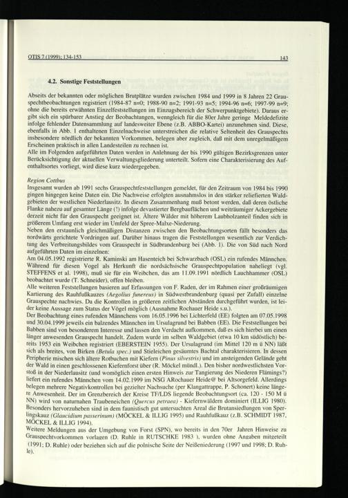 Abseits der bekannten oder möglichen Brutplätze wurden zwischen 1984 und 1999 in 8 Jahren 22 Grauspechtbeobachtungen registriert(1984-87 n=0; 1988-90 n=2; 1991-93 n=5; 1994-96 n=6; 1997-99 n=9; ohne die bereits erwähnten Einzelfeststellungen im Einzugsbereich der Schwerpunktgebiete). Daraus ergibt sich ein spürbarer Anstieg der Beobachtungen, wenngleich für die 80er Jahre geringe Meldedefizite infolge fehlender Datensammlung auf landesweiter Ebene(z.B. ABBO-Kartei) anzunehmen sind. Diese, ebenfalls in Abb. 1 enthaltenen Einzelnachweise unterstreichen die relative Seltenheit des Grauspechts insbesondere nördlich der bekannten Vorkommen, belegen aber zugleich, daß mit dem unregelmäßigem Erscheinen praktisch in allen Landesteilen zu rechnen ist.