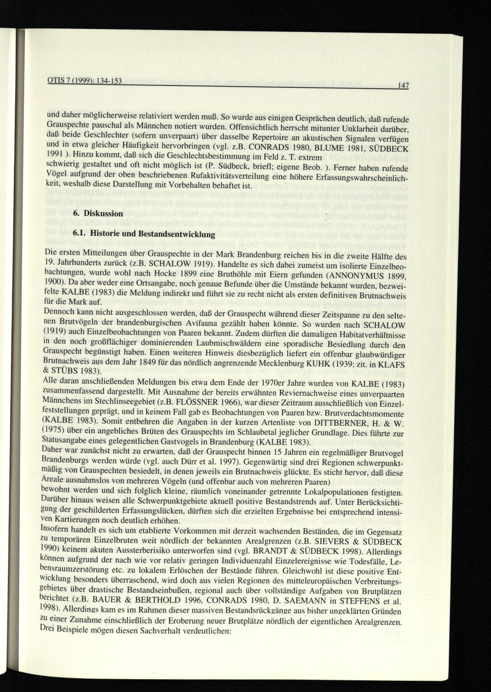 und daher möglicherweise relativiert werden muß. So wurde aus einigen Gesprächen deutlich, daß rufende Grauspechte pauschal als Männchen notiert wurden. Offensichtlich herrscht mitunter Unklarheit darüber, daß beide Geschlechter(sofern unverpaart) über dasselbe Repertoire an akustischen Signalen verfügen und in etwa gleicher Häufigkeit hervorbringen(vgl. z.B. CONRADS 1980, BLUME 1981, SÜDBECK 1991). Hinzu kommt, daß sich die Geschlechtsbestimmung im Feld z. T. extrem