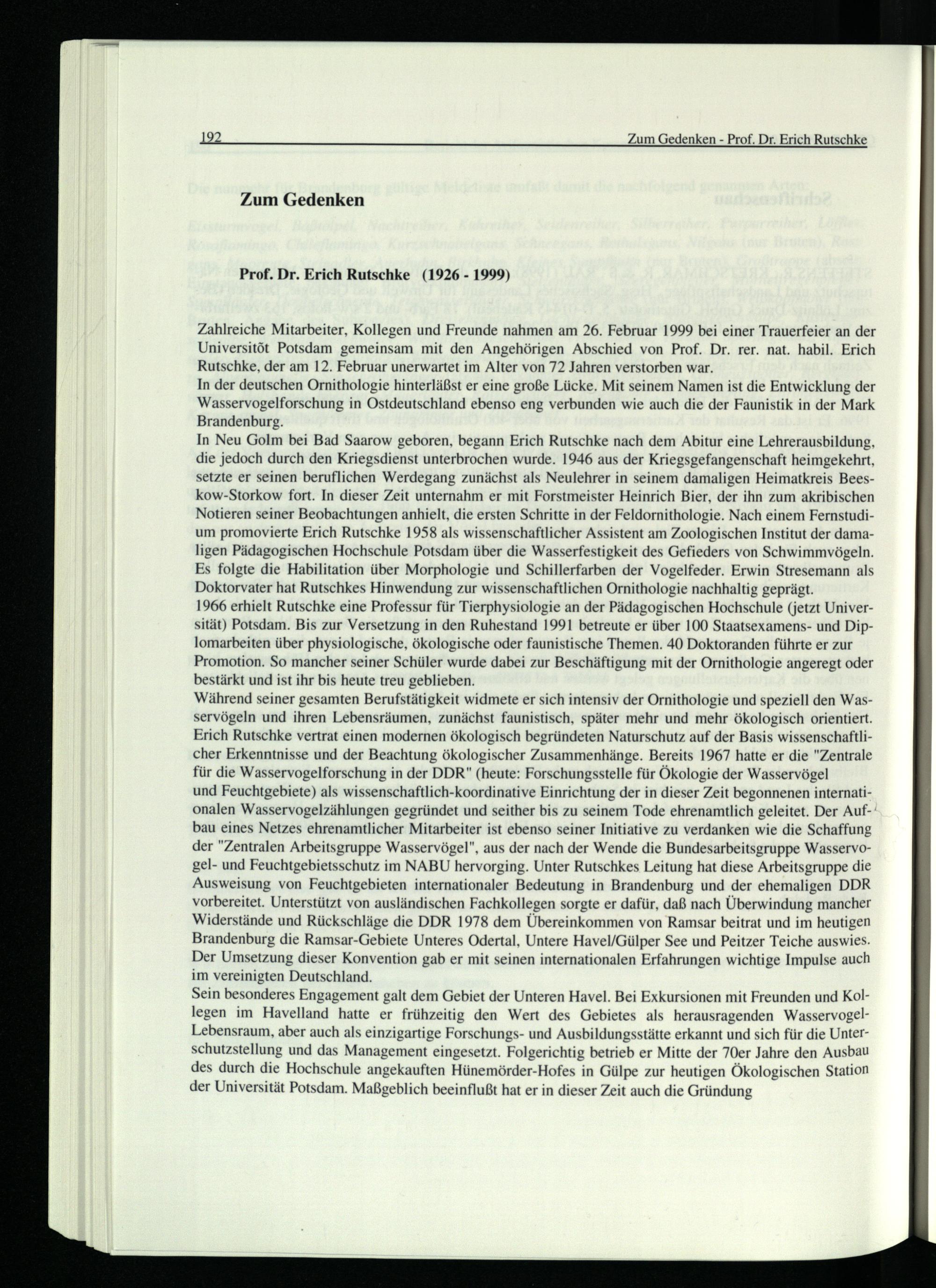 In der deutschen Ornithologie hinterläßst er eine große Lücke. Mit seinem Namen ist die Entwicklung der Wasservogelforschung in Ostdeutschland ebenso eng verbunden wie auch die der Faunistik in der Mark Brandenburg.
