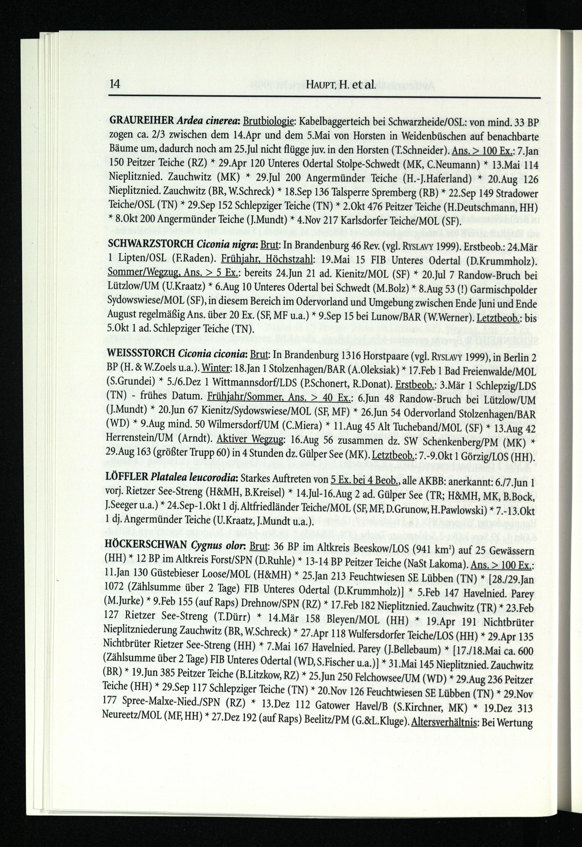 WEISSSTORCH Ciconia ciconia: Brut: In Brandenburg 1316 Horstpaare(vgl. RYSLAVY 1999), in Berlin 2 BP(H.& W.Zoels u.a.). Winter: 18.Jan 1 Stolzenhagen/BAR(A.Oleksiak)* 17.Feb 1 Bad Freienwalde/MOL (S.Grundei)* 5./6.Dez 1 Wittmannsdorf/LDS (P.Schonert, R.Donat). Erstbeob.: 3.Mär 1 Schlepzig/LDS (TN)- frühes Datum. Frühjahr/Sommer, Ans.> 40 Ex.: 6.Jun 48 Randow-Bruch bei Lützlow/UM (J.Mundt)* 20.Jun 67 Kienitz/Sydowswiese/MOL(SE, MF)* 26.Jun 54 Odervorland Stolzenhagen/BAR (WD)* 9.Aug mind. 50 Wilmersdorf/UM(C.Miera)* 11.Aug 45 Alt Tucheband/MOL (SF)* 13.Aug 42 Herrenstein/UM (Arndt). Aktiver Wegzug: 16.Aug 56 zusammen dz. SW Schenkenberg/PM(MK)* 29.Aug 163(größter Trupp 60) in 4 Stunden dz. Gülper See(MK). Letztbeob.: 7.-9.Okt 1 Görzig/LOS(HH).