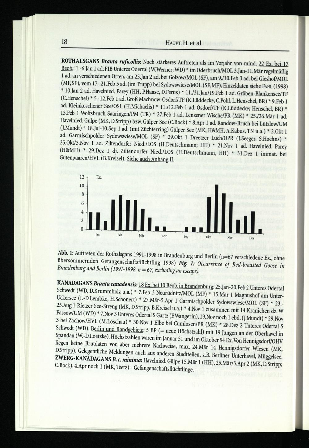 ROTHALSGANS Branta ruficollis: Noch stärkeres Auftreten als im Vorjahr von mind. 22 Ex. bei 17 Beob.: 1.-6.Jan 1 ad. FIB Unteres Odertal(W.Werner; WD)* im Oderbruch/MOL 3.Jan-11.Mär regelmäßig 1 ad. an verschiedenen Orten, am 23.Jan 2 ad. bei Golzow/MOL (SF), am 9./10.Feb 3 ad. bei Gieshof/MOL (ME SF), vom 17.-21.Feb 5 ad.(im Trupp) bei Sydowswiese/MOL(SE MF), Einzeldaten siehe FAHL(1998) * 10.Jan 2 ad. Havelnied. Parey (HH , P.Haase, D.Ferus)* 11./31.Jan/19.Feb 1 ad. Gröben-Blankensee/TF (C.Henschel)* 5.-12.Feb 1 ad. Groß Machnow-Osdorf/TF (K.Lüddecke, C.Pohl, L.Henschel, BR )* 9.Feb 1 ad. Kleinkoschener See/OSL (H.Michaelis)* 11./12.Feb 1 ad. Osdorf/TF (K.Lüddecke; Henschel, BR )* 13.Feb 1 Wolfsbruch Saaringen/PM(TR)* 27.Feb 1 ad. Lenzener Wische/PR(MK)* 25./26.Mär 1 ad. Havelnied. Gülpe(MK, D.Stripp) bzw. Gülper See(C.Bock)* 8.Apr 1 ad. Randow-Bruch bei Lützlow/UM (J.Mundt)* 18.Jul-10.Sep 1 ad.(mit Züchterring) Gülper See(MK, H&MH, A.Kabus, TN u.a.)* 2.Okt 1 ad. Garmischpolder Sydowswiese/MOL(SF)* 29.Okt 1 Dreetzer Luch/OPR (J.Seeger, S.Hoehns)* 25.Okt/3.Nov 1 ad. Ziltendorfer Nied. /LOS(H.Deutschmann; HH )* 21.Nov 1 ad. Havelnied. Parey (H&MH)* 29.Dez 1 dj. Ziltendorfer Nied. /LOS(H.Deutschmann, HH )* 31.Dez 1 immat. bei Gutenpaaren/HVL (B.Kreisel). Siehe auch Anhang II.