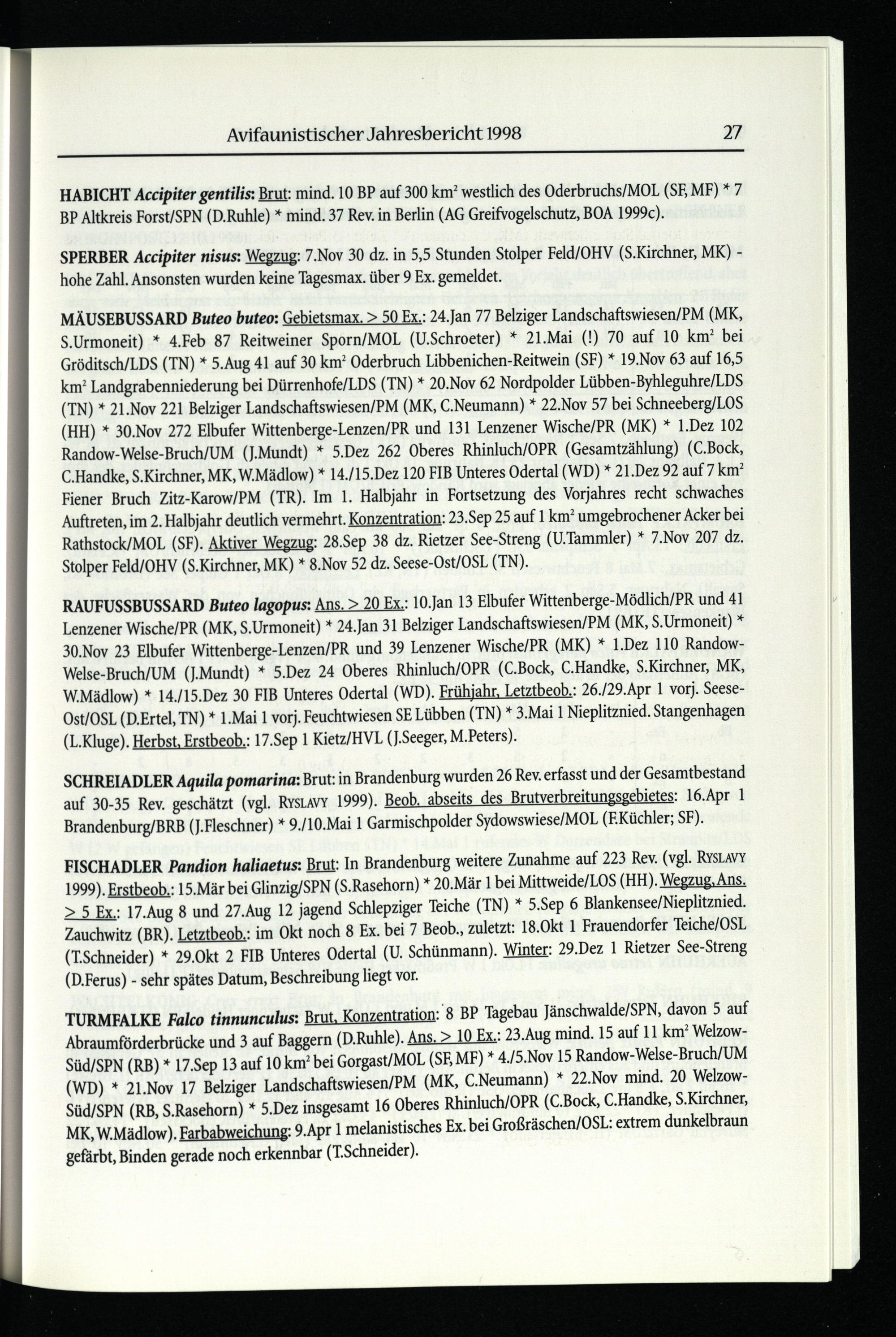 RAUFUSSBUSSARD Buteo lagopus: Ans.> 20 Ex.: 10.Jan 13 Elbufer Wittenberge -Mödlich/PR und 41 Lenzener Wische/PR(MK, S.Urmoneit)* 24.Jan 31 Belziger Landschaftswiesen/PM(MK, S.Urmoneit)* 30.Nov 23 Elbufer Wittenberge-Lenzen/PR und 39 Lenzener Wische/PR(MK)* 1.Dez 110 RandowWelse-Bruch/UM(J.Mundt)* 5.Dez 24 Oberes Rhinluch/OPR (C.Bock, C.Handke, S.Kirchner, MK, W.Mädlow)* 14./15.Dez 30 FIB Unteres Odertal(WD). Frühjahr, Letztbeob.: 26./29.Apr 1 vorj. SeeseOst/OSL (D.Ertel, TN)* 1.Mai 1 vorj. Feuchtwiesen SE Lübben(TN)* 3.Mai 1 Nieplitznied. Stangenhagen (L.Kluge). Herbst, Erstbeob.: 17.Sep 1 Kietz/HVL (J.Seeger, M.Peters).